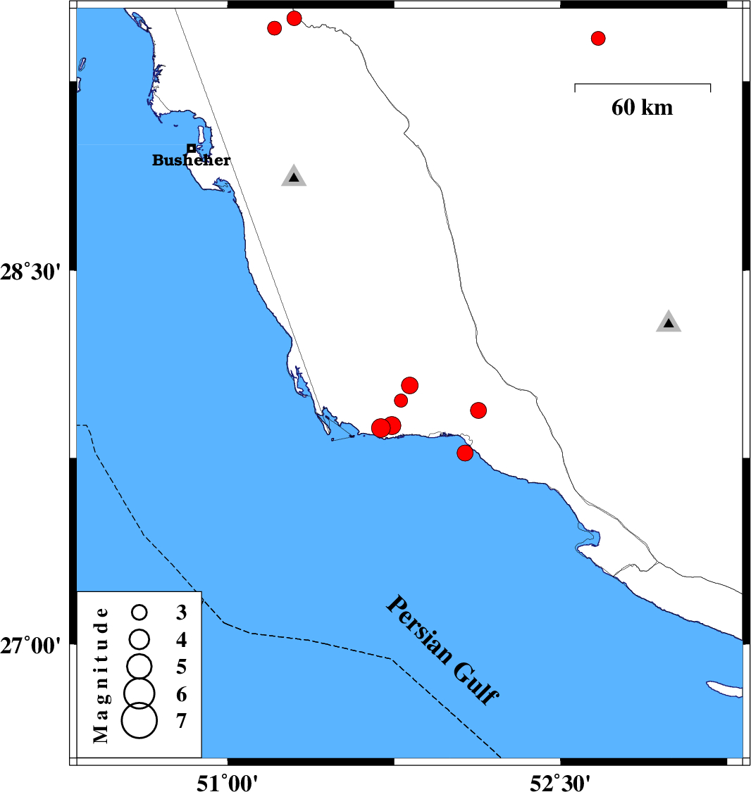 2012/03/22 | 02:06:14.1 | 06:36:14.1 | 27.98 | 51.78 | 38 | ML:2.7 | Bushehr Province, 32 km North-West of Bandar-e kangan | ||
