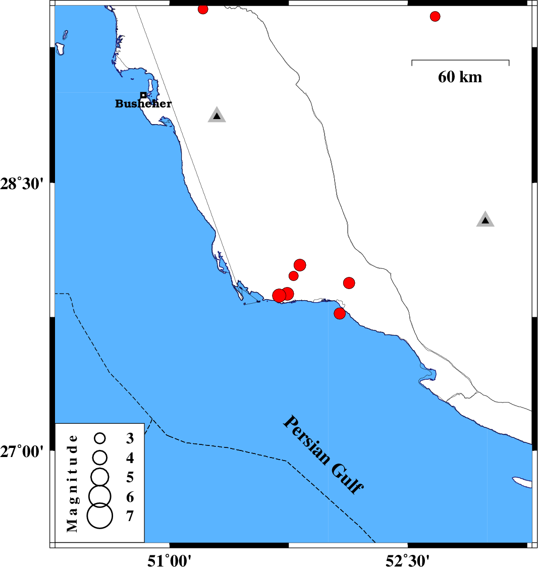 2012/03/22 | 02:06:14.1 | 06:36:14.1 | 27.98 | 51.78 | 38 | ML:2.7 | Bushehr Province, 32 km North-West of Bandar-e kangan | ||