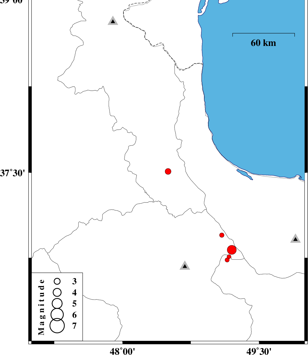 2012/03/23 | 05:13:08.1 | 09:43:08.1 | 37.51 | 48.5 | 14 | ML:3 | Ardebil Province, 13 km South of Khalkhal | ||