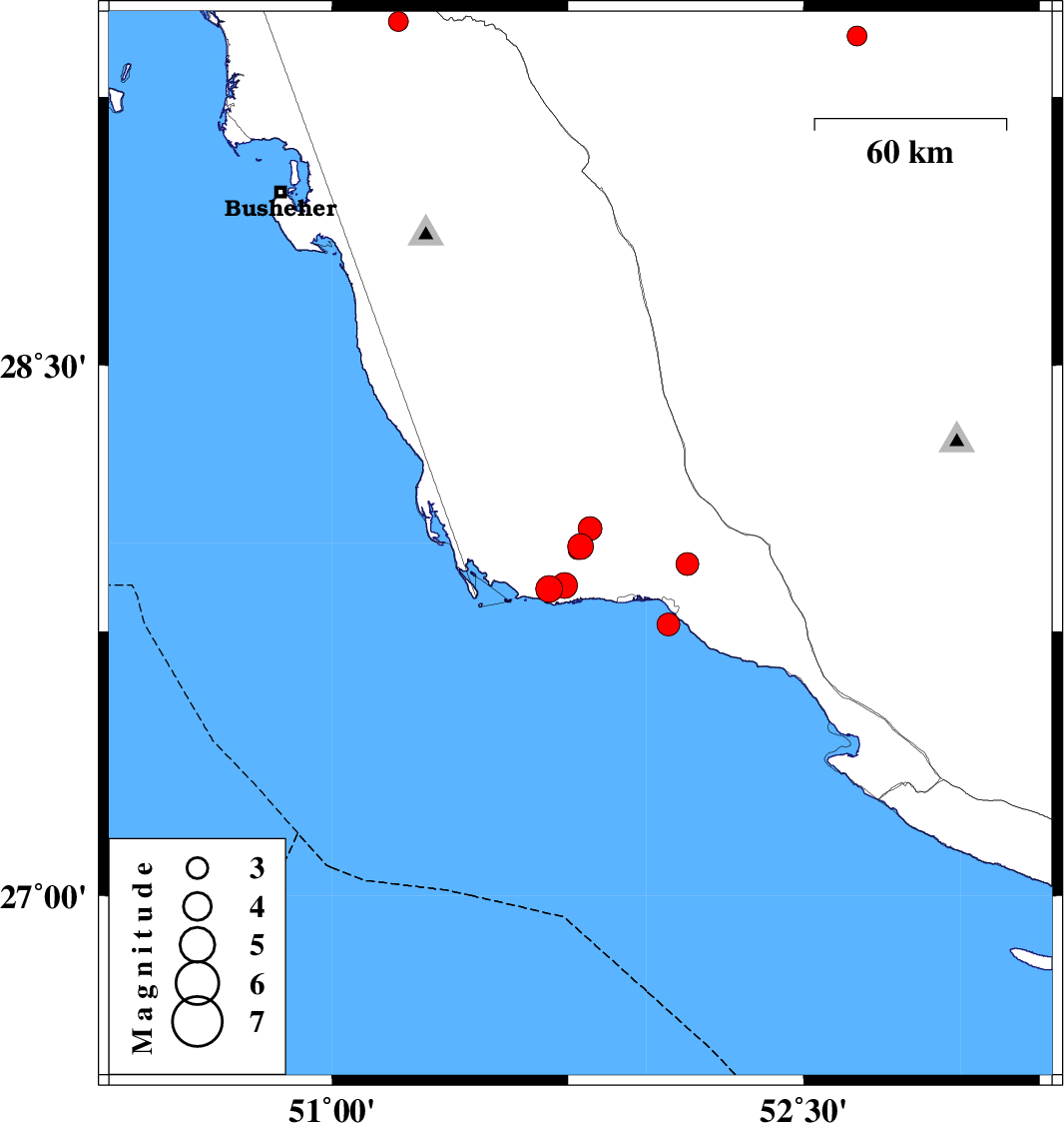 2012/03/22 | 02:06:14.1 | 06:36:14.1 | 27.98 | 51.78 | 38 | ML:2.7 | Bushehr Province, 32 km North-West of Bandar-e kangan | ||