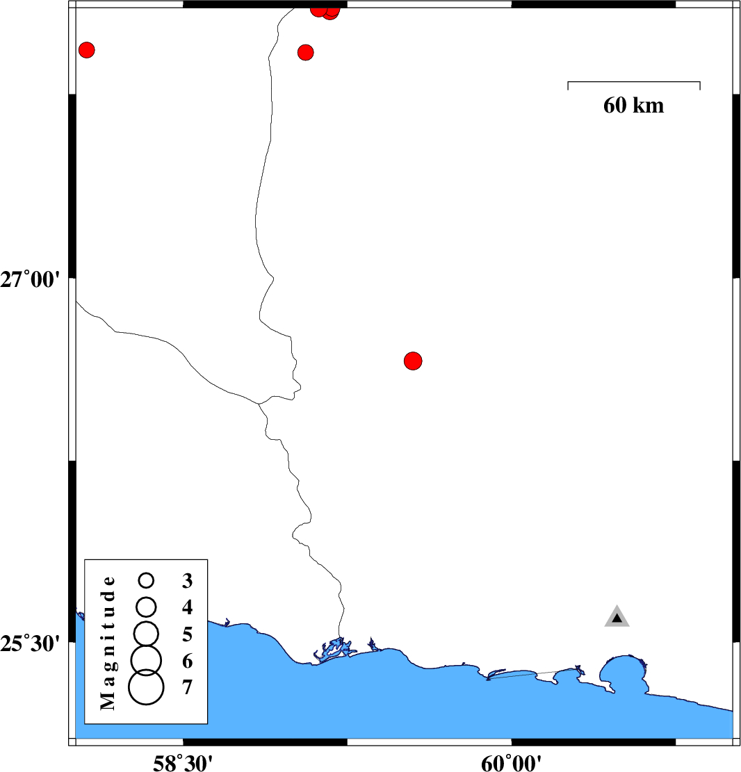 2012/03/11 | 06:03:17.5 | 09:33:17.5 | 27.86 | 59.02 | 15 | ML:3.2 | Sistan va Baloochestan Province, 131 km East of Kahnuj | ||