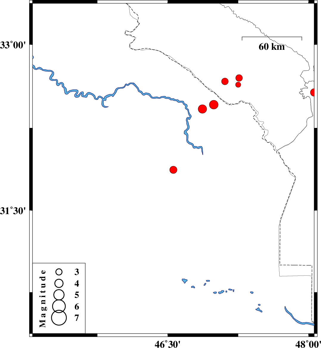 2012/03/24 | 05:25:36.7 | 09:55:36.7 | 32.46 | 46.99 | 44 | ML:4.2 | Iraq, 36 km South-West of Dehloran | ||