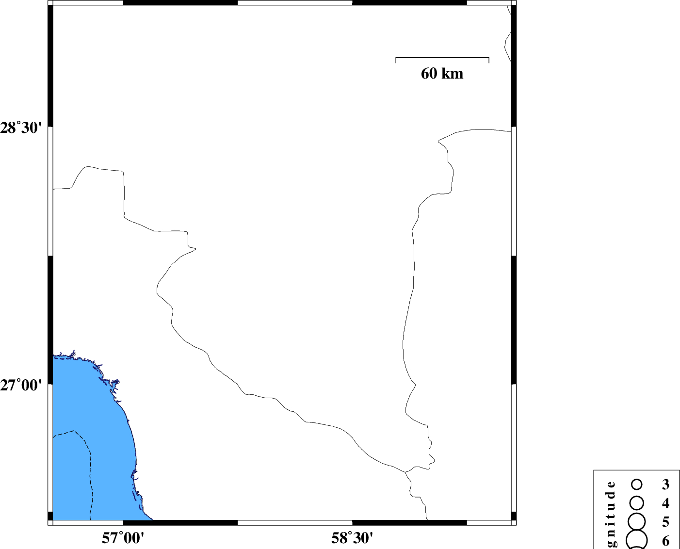 2012/04/16 | 02:15:15.5 | 06:45:15.5 | 28.08 | 56.9 | 18 | ML:3.3 | Hormozgan Province, 79 km North-West of Kahnuj |