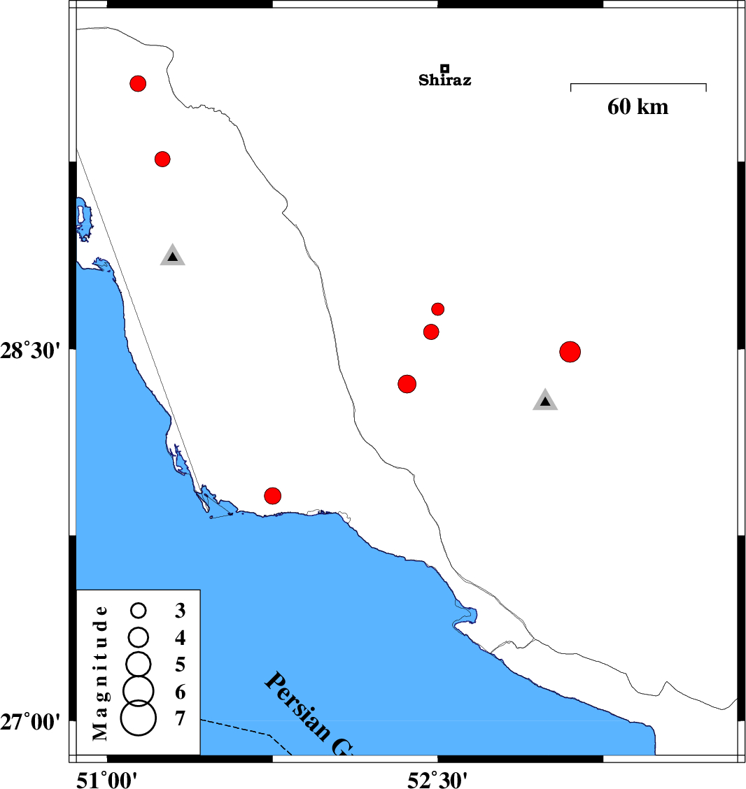 2012/03/29 | 04:30:55.5 | 09:00:55.5 | 29.56 | 51.14 | 14 | ML:3.2 | Bushehr Province, 34 km North of Borazjan | ||