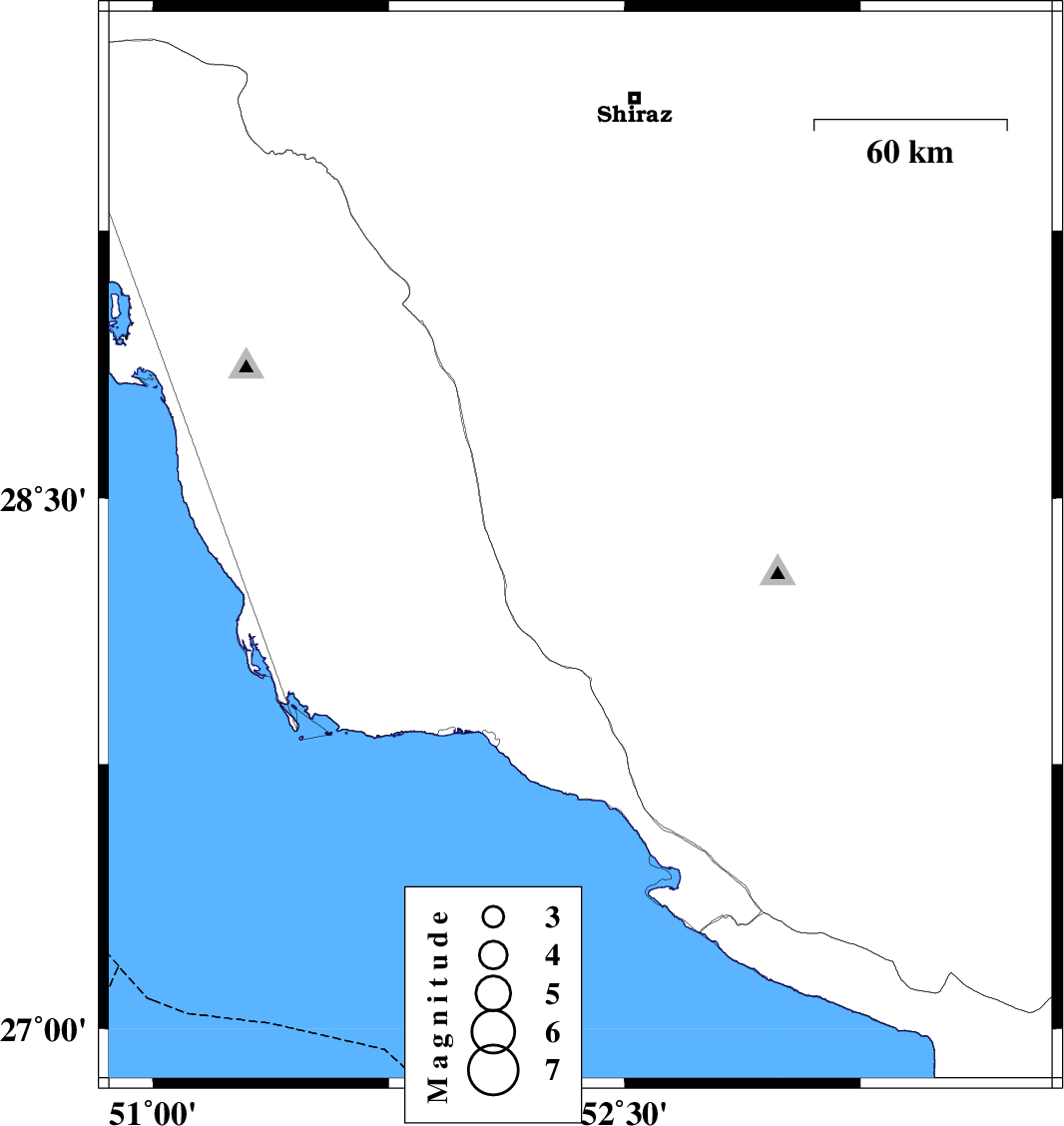Map Region : lat:26.86-29.86 lon:50.86-53.86 Map's coordinate is invalid North ** West ** East ** South ** Show Cities Province Center None Province And Township Center Show Foreign Cities Yes No Show Fault Mechanism Yes No Show Province Boundaries Yes No Show Stations No Yes With Name Yes Without Name Map Title Invalid Title Get Ascii Data in Format : List Seisan GSE2.0 Prel. Rep.DateTime(UTC)Time(Local)Lat.Lon.DepthMag.RegionWaveform 2012/04/26 00:30:05.5 05:00:05.5 28.3652.3634 ML:3.6 Fars Province, 59 km North of Jam