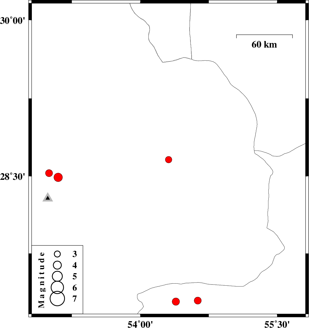 2012/05/03 | 02:12:29.2 | 06:42:29.2 | 28.66 | 54.31 | 14 | ML:3.2 | Fars Province, 24 km West of Darab | ||