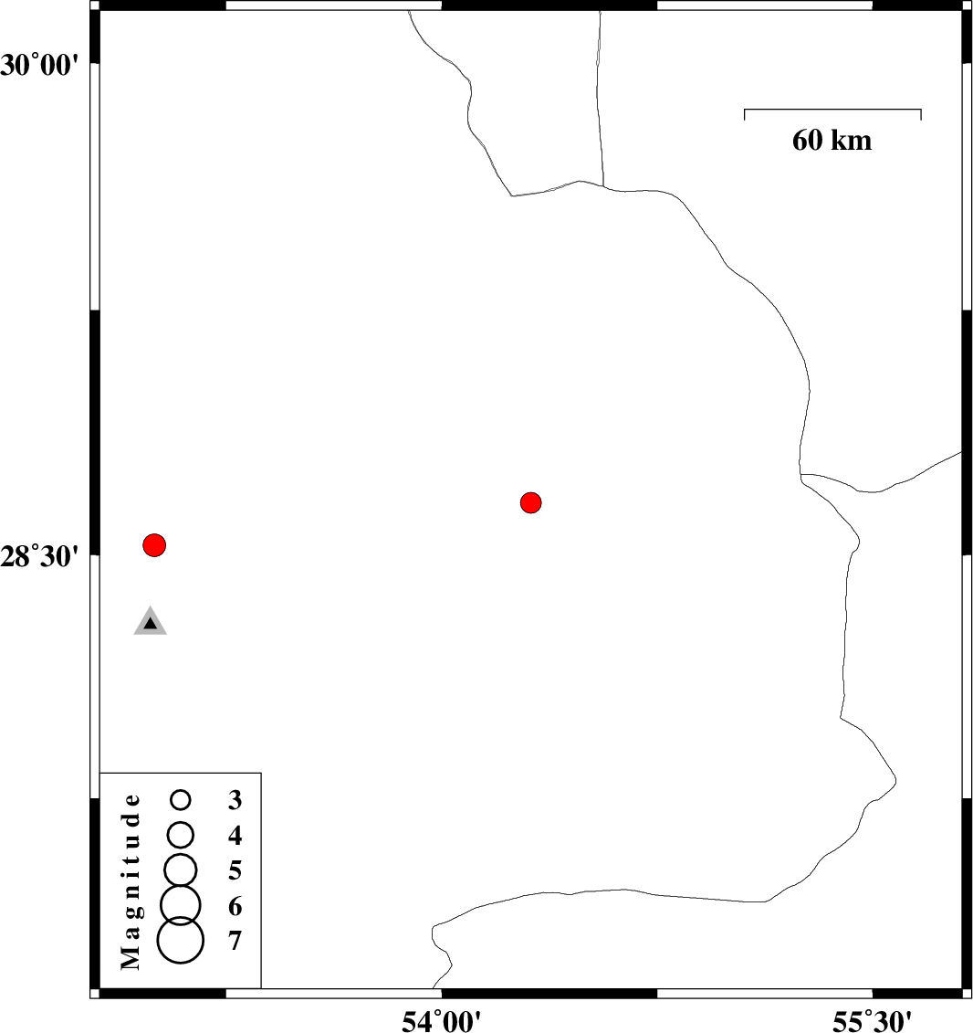 2012/05/03 | 02:12:29.2 | 06:42:29.2 | 28.66 | 54.31 | 14 | ML:3.2 | Fars Province, 24 km West of Darab | ||
