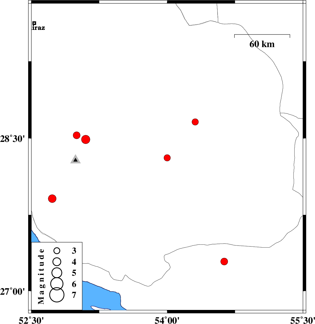 2012/05/12 | 01:18:00.1 | 05:48:00.1 | 28.31 | 54 | 45 | ML:3.2 | Fars Province, 48 km South-East of Jahrom | ||