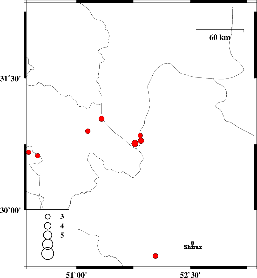2012/05/14 | 17:18:46.9 | 21:48:46.9 | 30.85 | 51.84 | 14 | ML:2.8 | Fars Province, 37 km East of Sisakht | ||