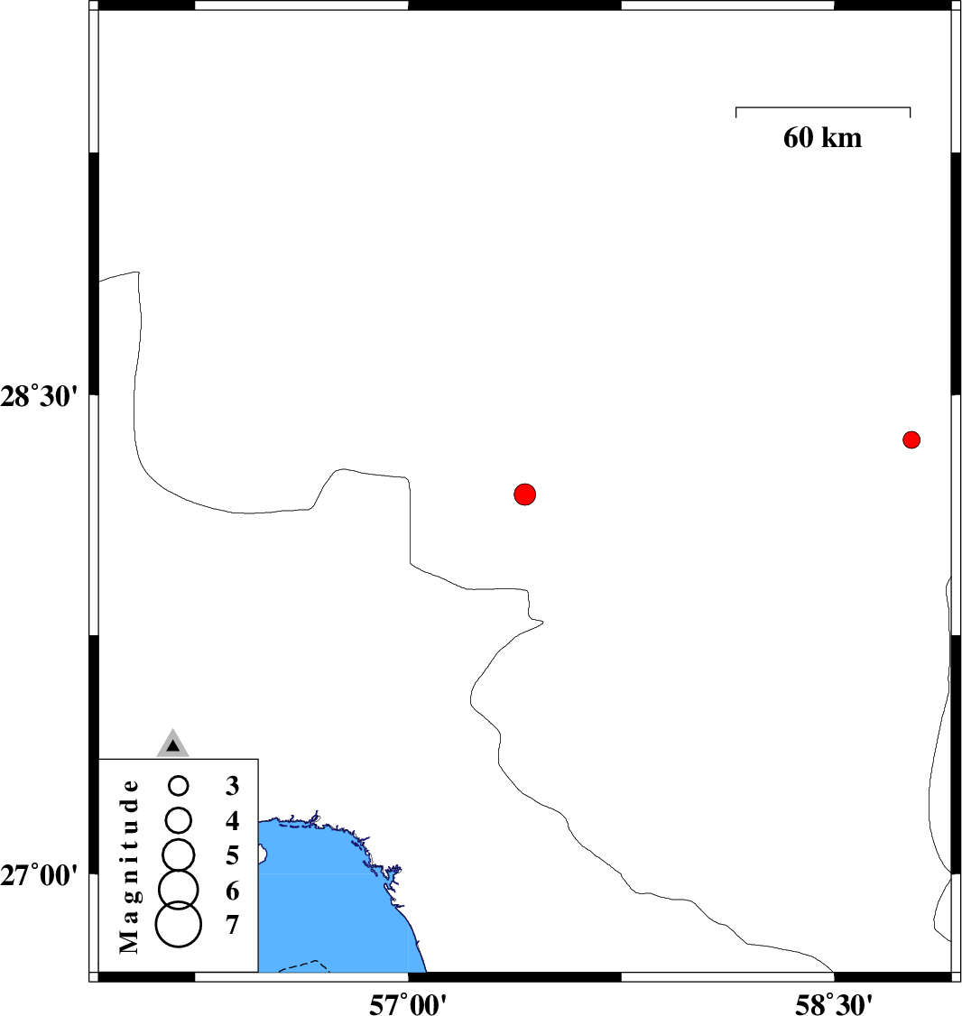 2012/05/29 | 18:43:53.1 | 23:13:53.1 | 28.19 | 57.41 | 14 | ML:3.4 | Kerman Province, 39 km North-West of Kahnuj | ||