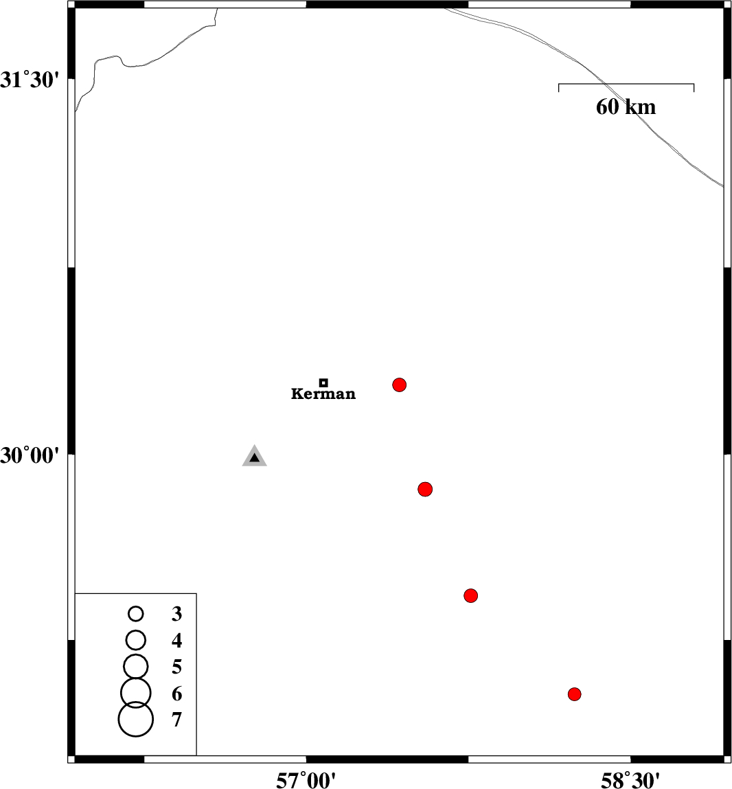 2012/05/19 | 01:46:35.4 | 06:16:35.4 | 29.86 | 57.55 | 37 | ML:3 | Kerman Province, 66 km South-East of Kerman | ||