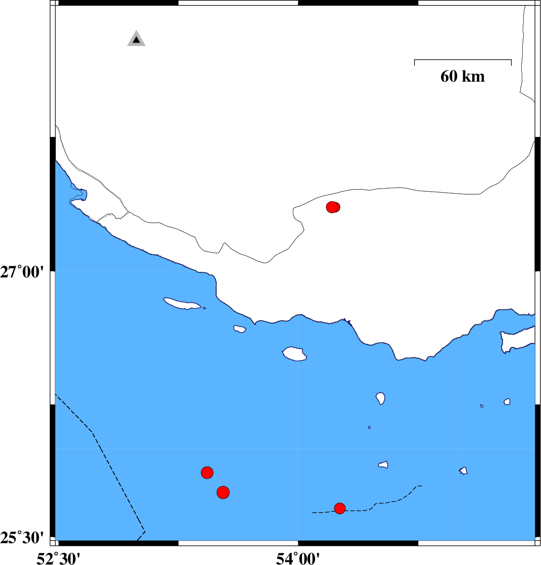 2012/06/03 | 16:52:59.7 | 21:22:59.7 | 26.78 | 54.81 | 31 | ML:3.1 | Hormozgan Province, 28 km North of Bandar-e lengeh | ||