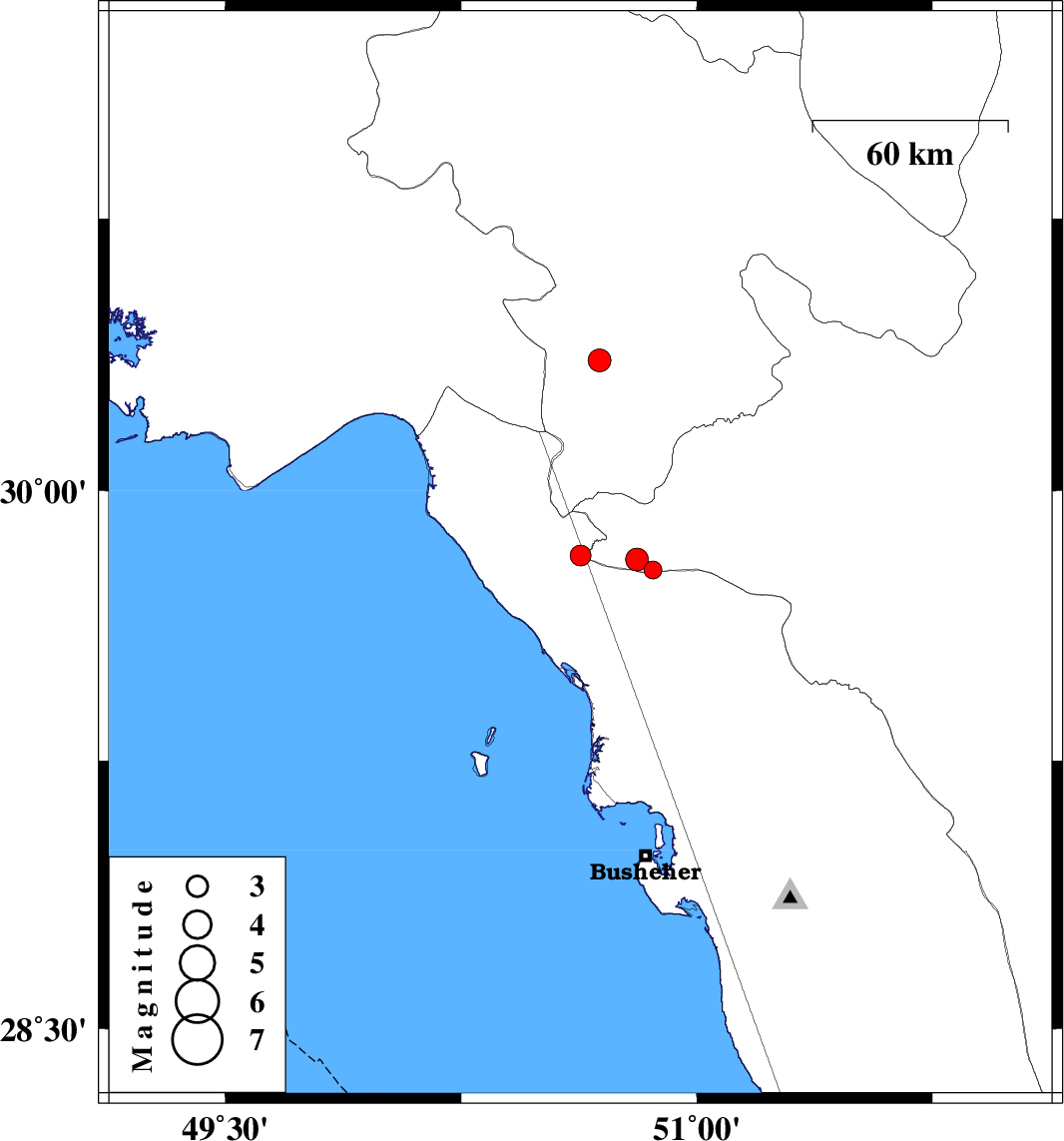 2012/06/04 | 19:04:19.9 | 23:34:19.9 | 29.82 | 50.63 | 46 | ML:2.9 | Bushehr Province, 29 km North-East of Bandar-e genaveh | ||