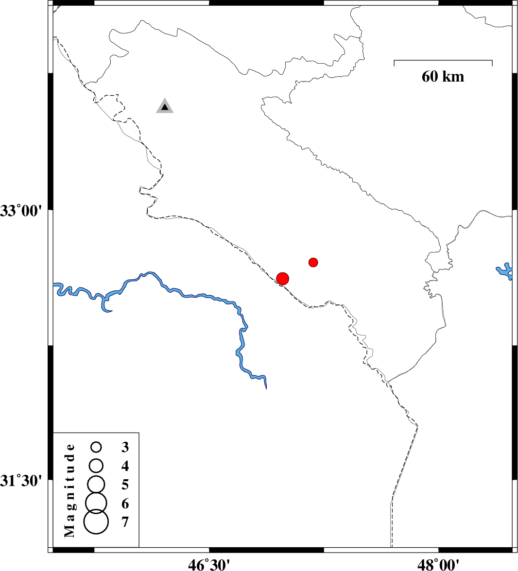 2012/06/08 | 03:44:21.7 | 08:14:21.7 | 32.71 | 47.18 | 46 | ML:2.7 | Ilam Province, 8 km Dehloran |