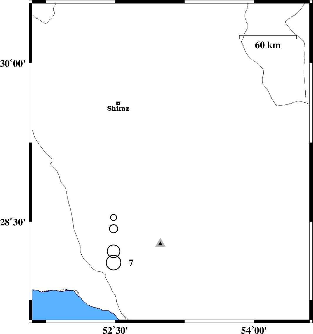 Map Region : lat:27.56-30.56 lon:51.6-54.6 Map's coordinate is invalid North ** West ** East ** South ** Show Cities Province Center None Province And Township Center Show Foreign Cities Yes No Show Fault Mechanism Yes No Show Province Boundaries Yes No Show Stations No Yes With Name Yes Without Name Map Title Invalid Title Get Ascii Data in Format : List Seisan GSE2.0 Prel. Rep.DateTime(UTC)Time(Local)Lat.Lon.DepthMag.RegionWaveform 2012/06/12 22:53:50.2 03:23:50.2 29.0653.115 ML:3.6 Fars Province, 54 km North-West of Fasa
