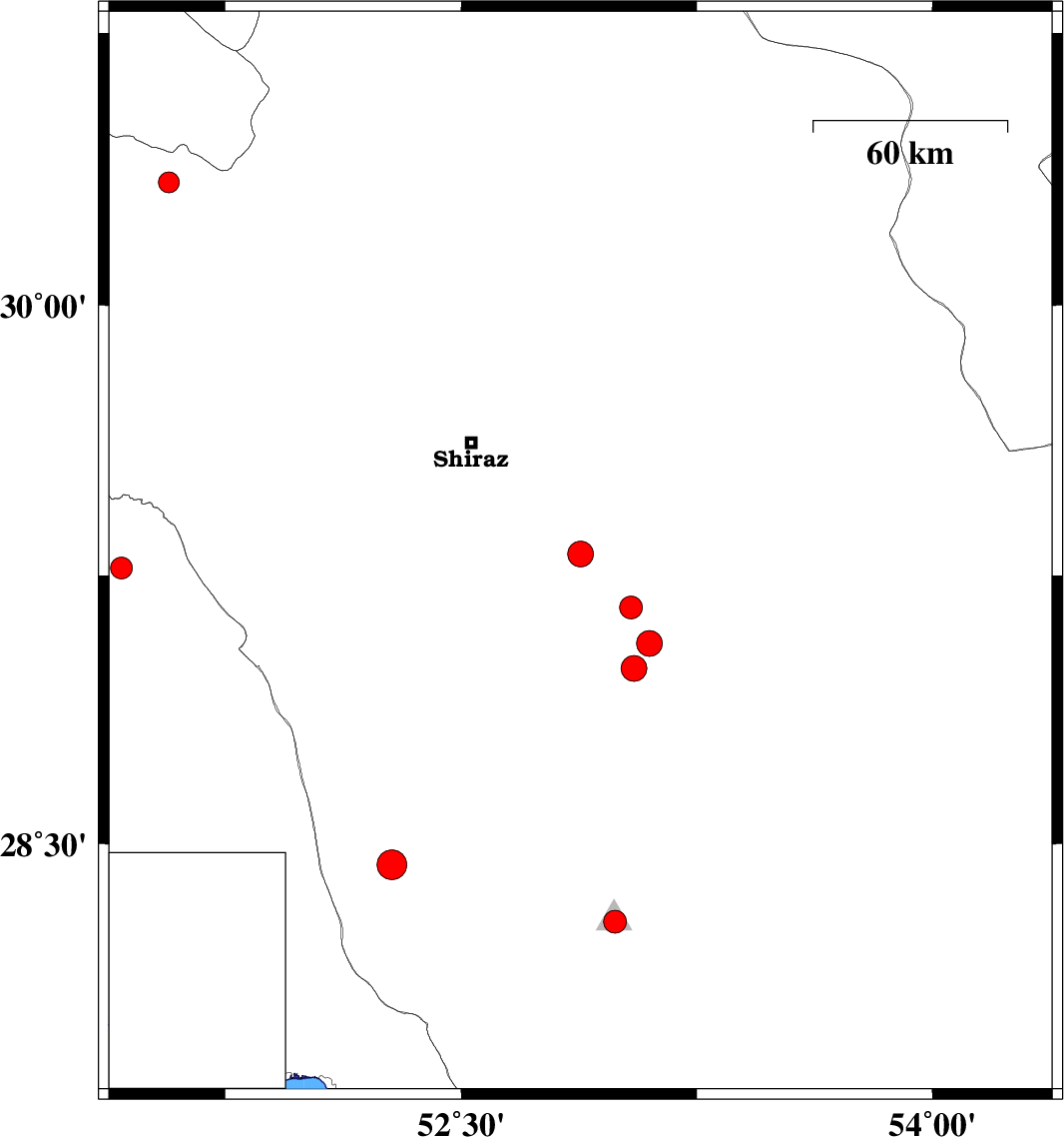 2012/06/11 | 09:35:04.2 | 14:05:04.2 | 29.27 | 51.42 | 15 | ML:3.1 | Bushehr Province, 20 km East of Borazjan | ||