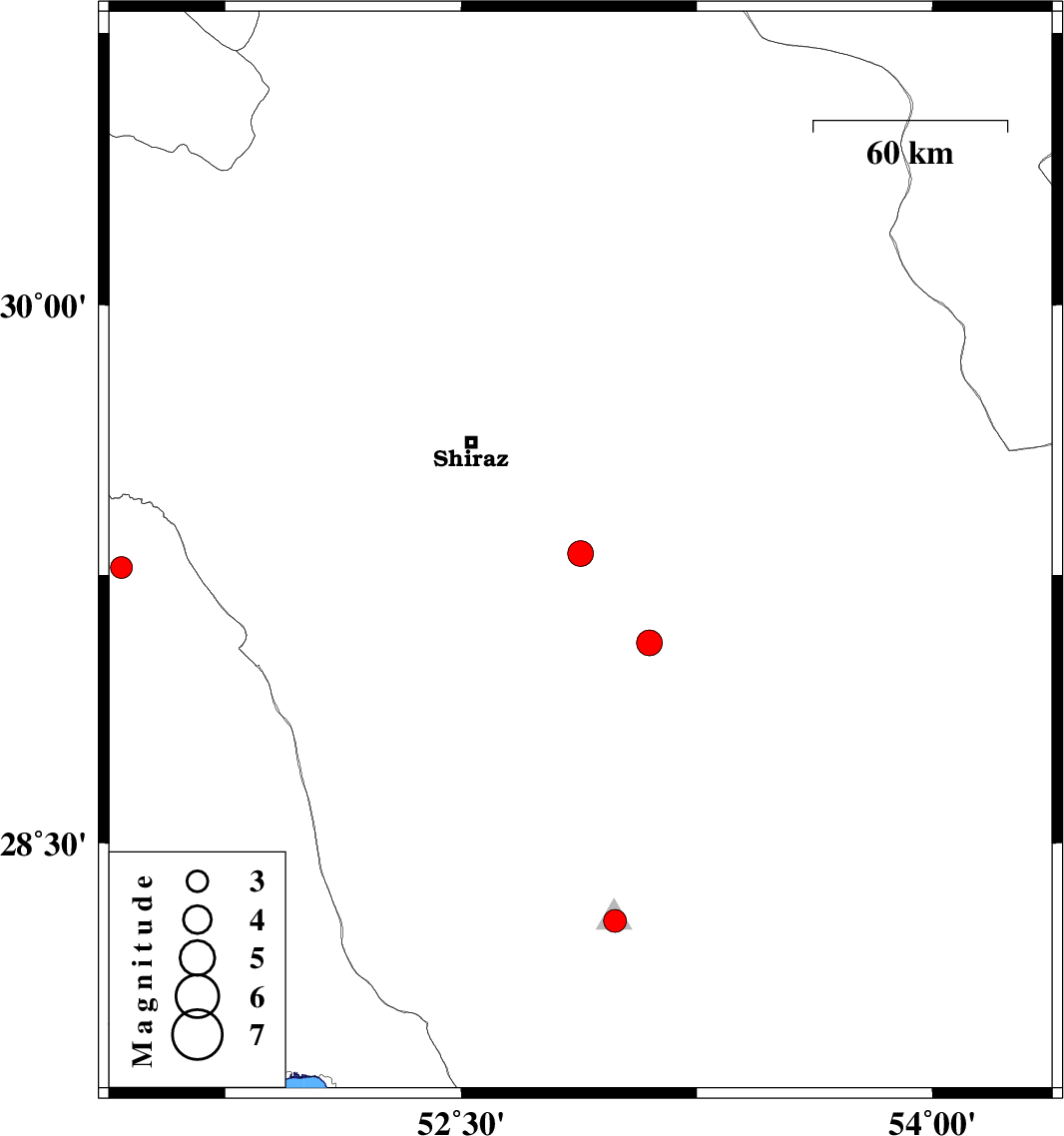 2012/06/11 | 09:35:04.2 | 14:05:04.2 | 29.27 | 51.42 | 15 | ML:3.1 | Bushehr Province, 20 km East of Borazjan |