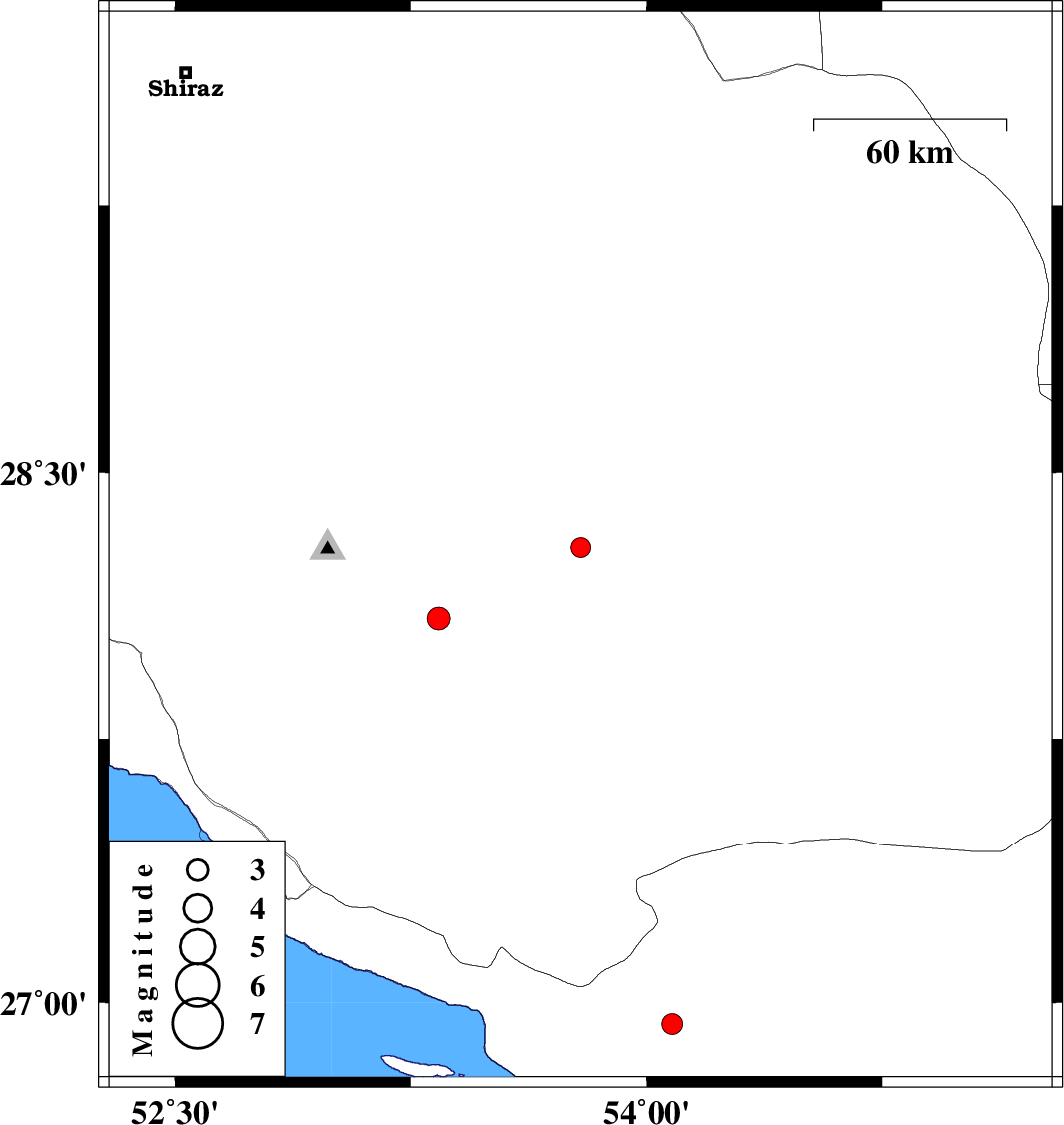 2012/06/25 | 22:29:48.6 | 02:59:48.6 | 26.94 | 54.08 | 38 | ML:2.9 | Hormozgan Province, 40 km South-West of Bastak | ||