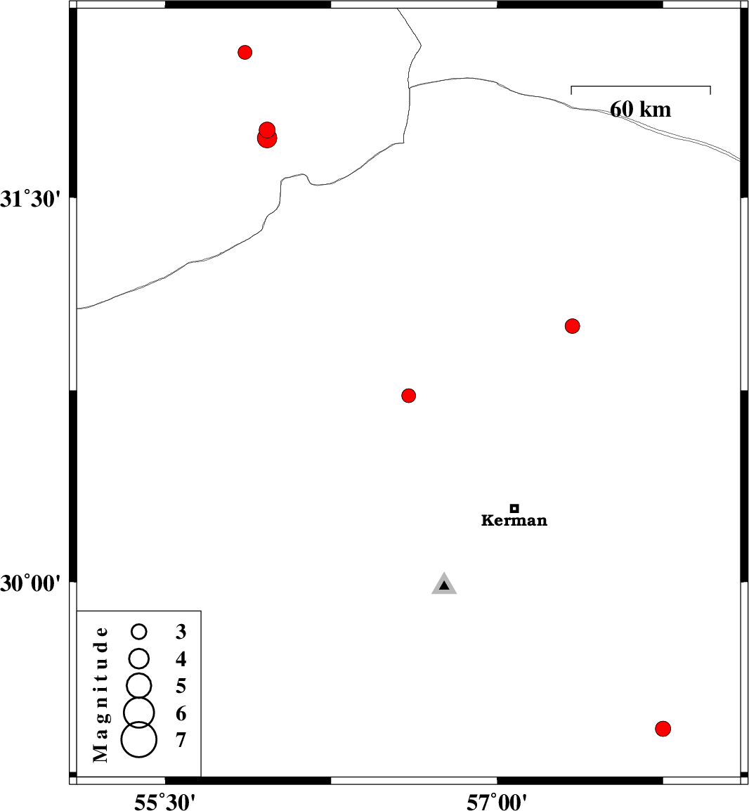 2012/07/18 | 06:54:05.6 | 11:24:05.6 | 31 | 57.34 | 14 | ML:3 | Kerman Province, 58 km South-East of Ravar | ||