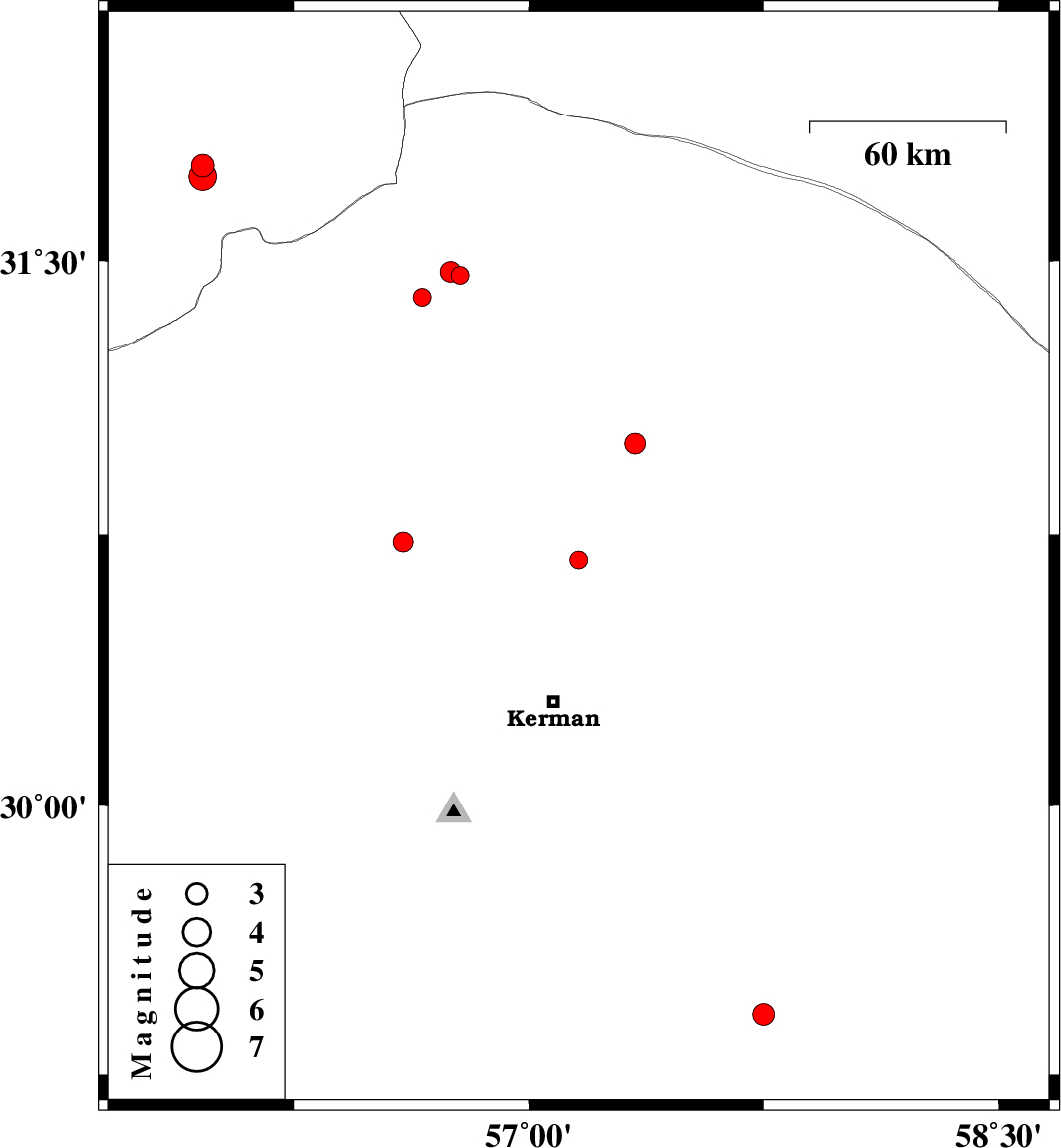 2012/08/02 | 09:41:29.9 | 14:11:29.9 | 31.4 | 56.66 | 14 | ML:2.5 | Kerman Province, 21 km North-West of Ravar | ||