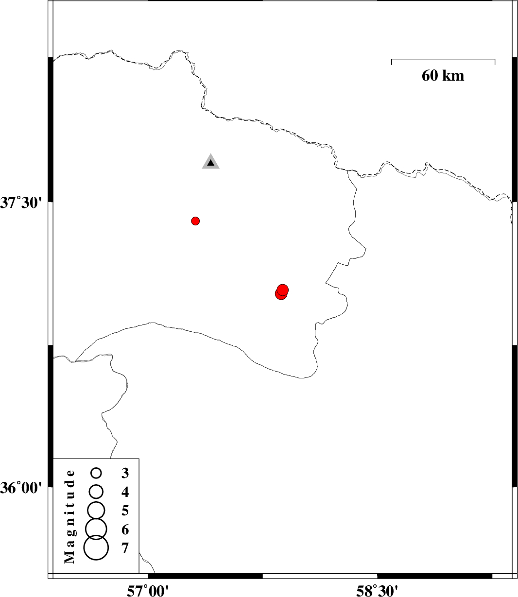 2012/08/25 | 06:32:17.9 | 11:02:17.9 | 37.02 | 57.87 | 6 | ML:3.5 | Khorasan(north) Province, 33 km East of Esfarayen | ||
