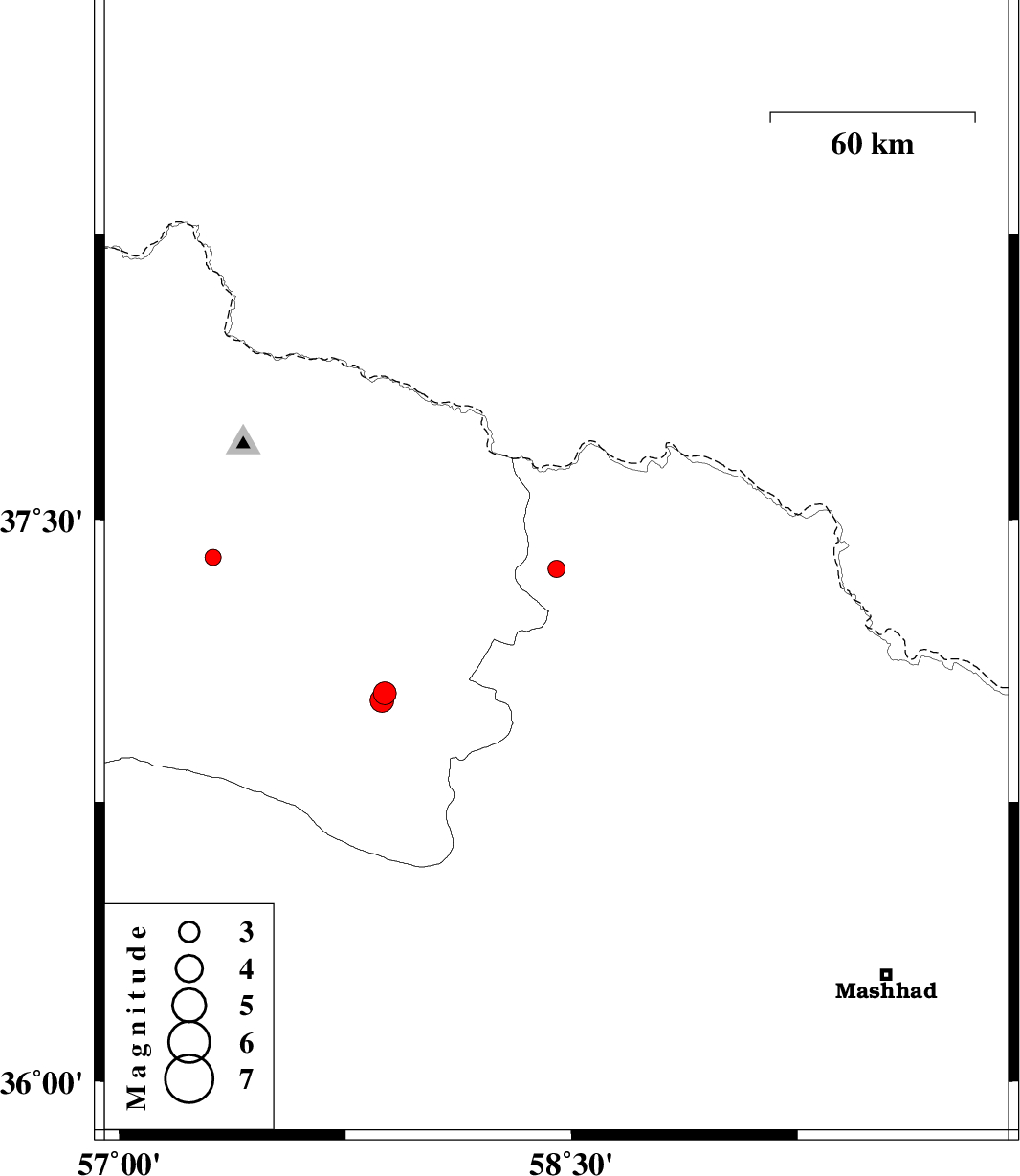 2012/08/25 | 06:32:17.9 | 11:02:17.9 | 37.02 | 57.87 | 6 | ML:3.5 | Khorasan(north) Province, 33 km East of Esfarayen | ||