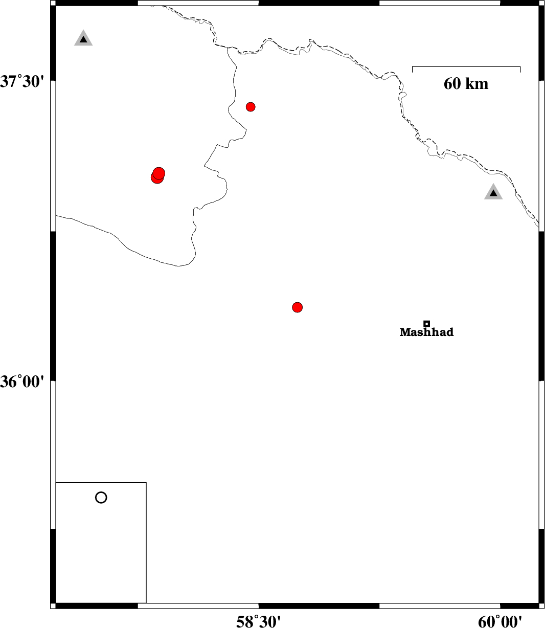 2012/08/27 | 15:40:16.3 | 20:10:16.3 | 37.37 | 58.45 | 14 | ML:2.6 | Khorasan(center) Province, 29 km North of Quchan | ||