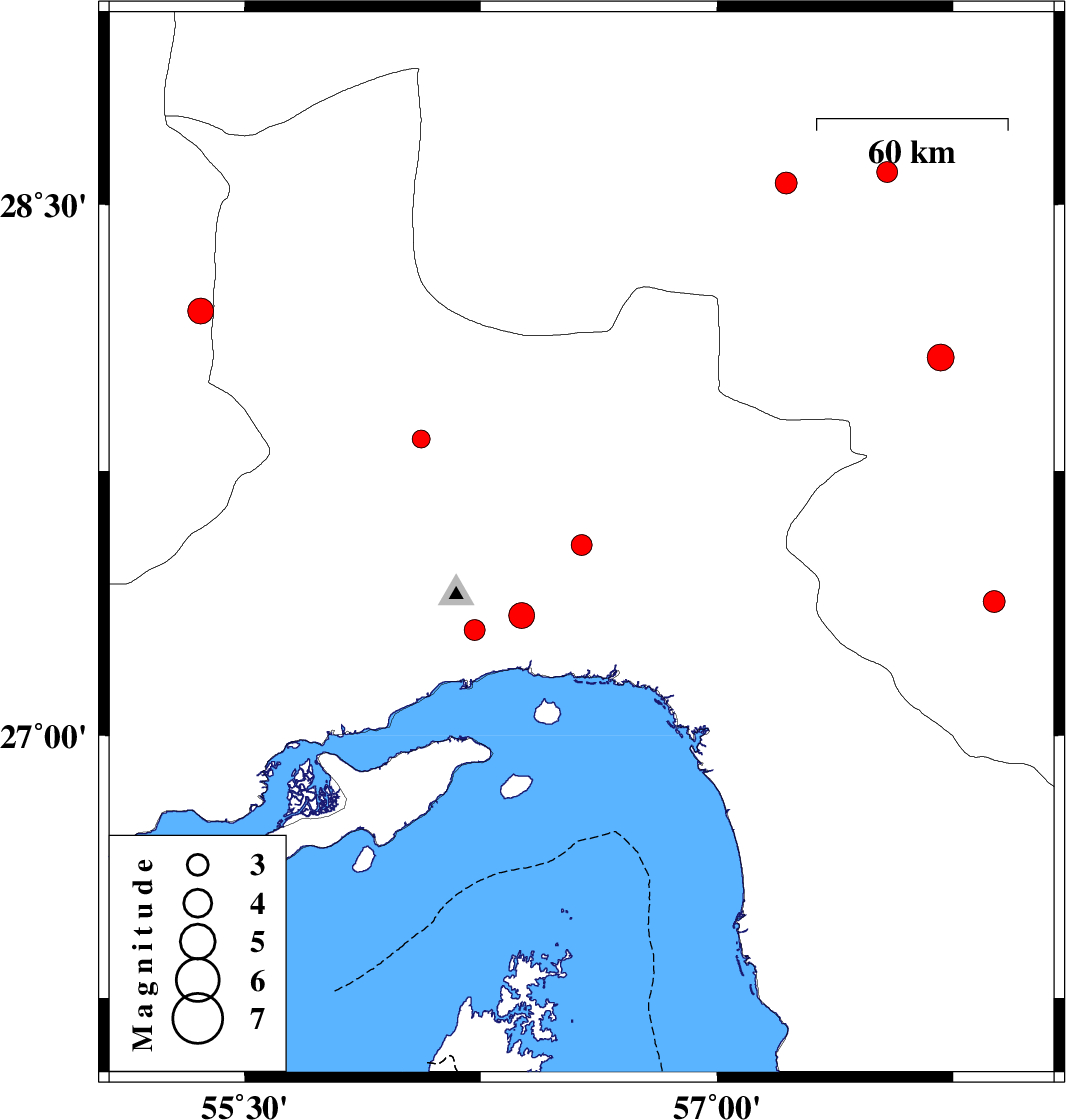 2012/08/07 | 18:52:28.6 | 23:22:28.6 | 27.34 | 56.38 | 14 | ML:3.7 | Hormozgan Province, 19 km North of Bandar-e abbas | ||