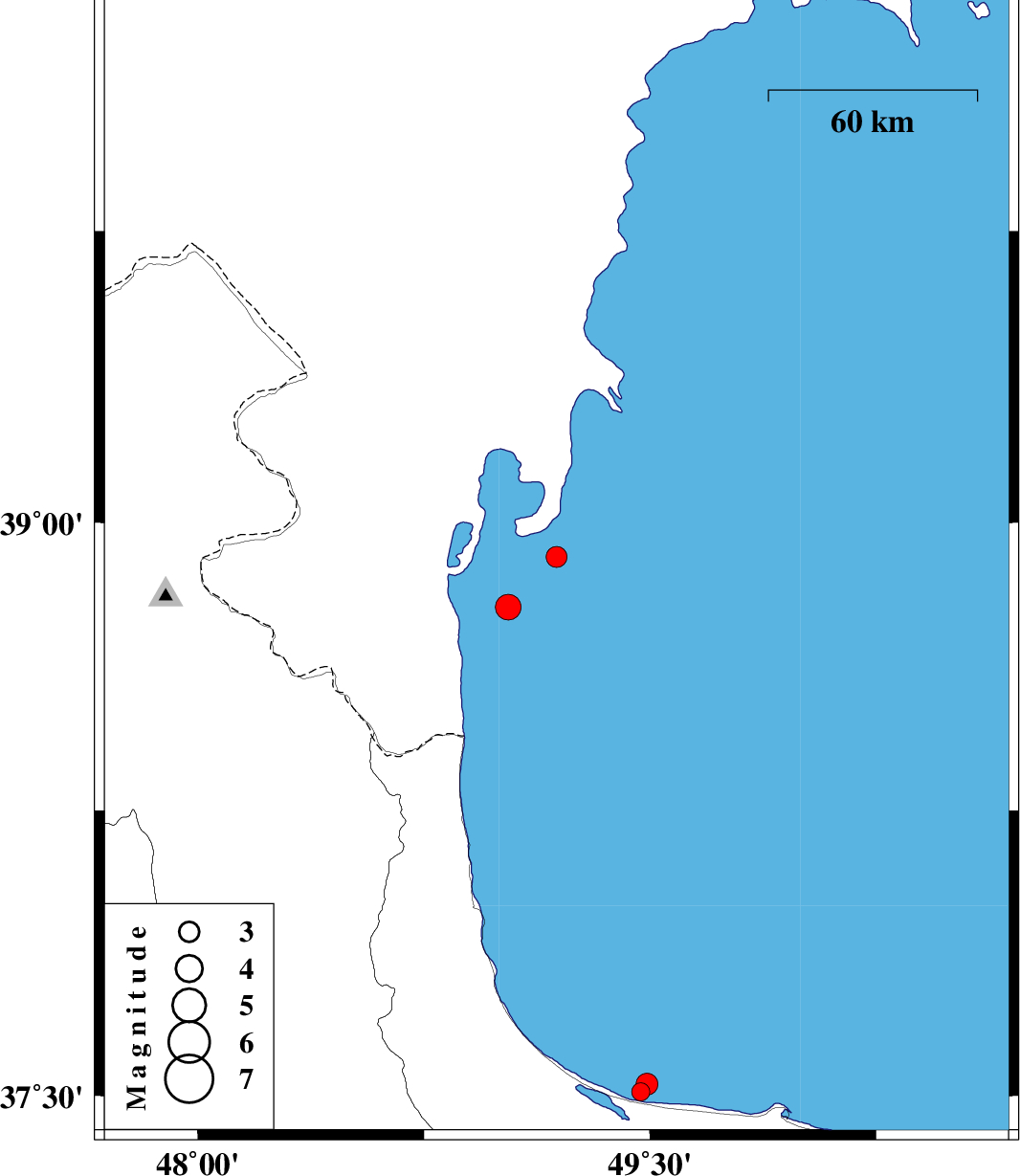 2012/09/02 | 04:08:15.4 | 08:38:15.4 | 38.91 | 49.19 | 6 | ML:3.1 | Caspian Sea, 62 km North-East of Astara | ||