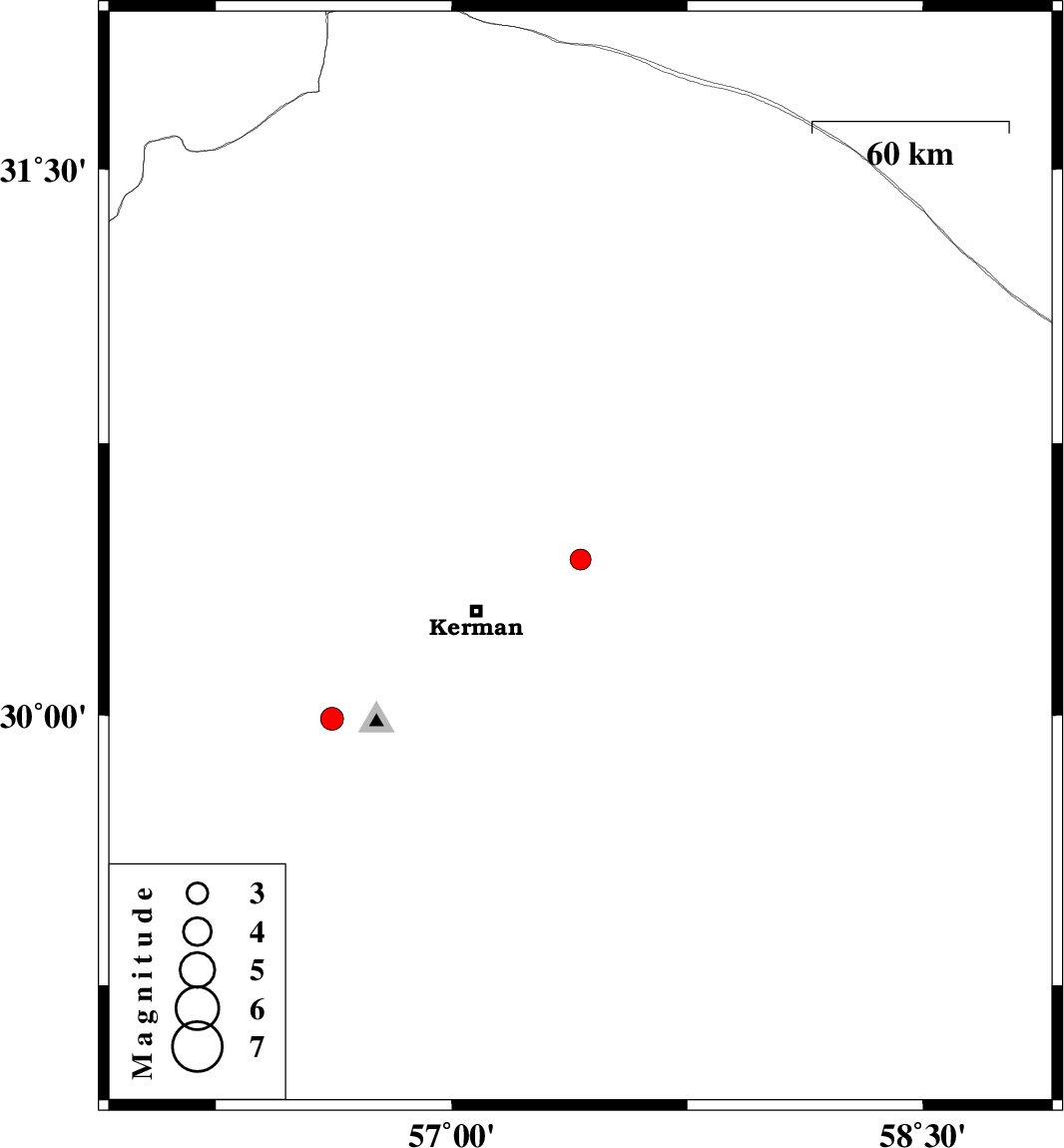 2012/09/18 | 13:22:54.5 | 17:52:54.5 | 30.43 | 57.41 | 14 | ML:2.9 | Kerman Province, 35 km North-East of Kerman | ||