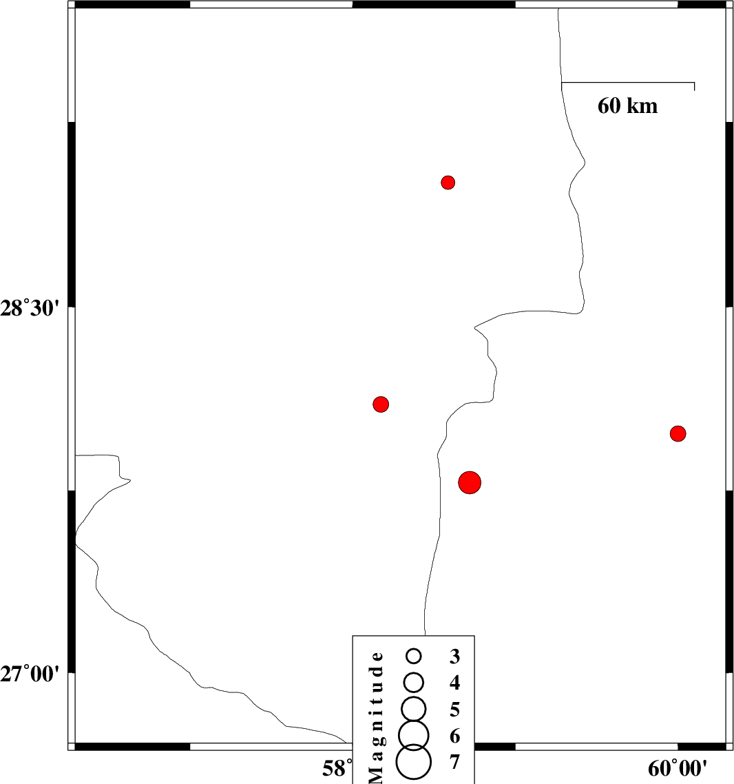 2012/09/02 | 00:57:23.9 | 05:27:23.9 | 29.7 | 59.72 | 18 | ML:3.9 | Sistan va Baloochestan Province, 113 km North-West of Zahedan |