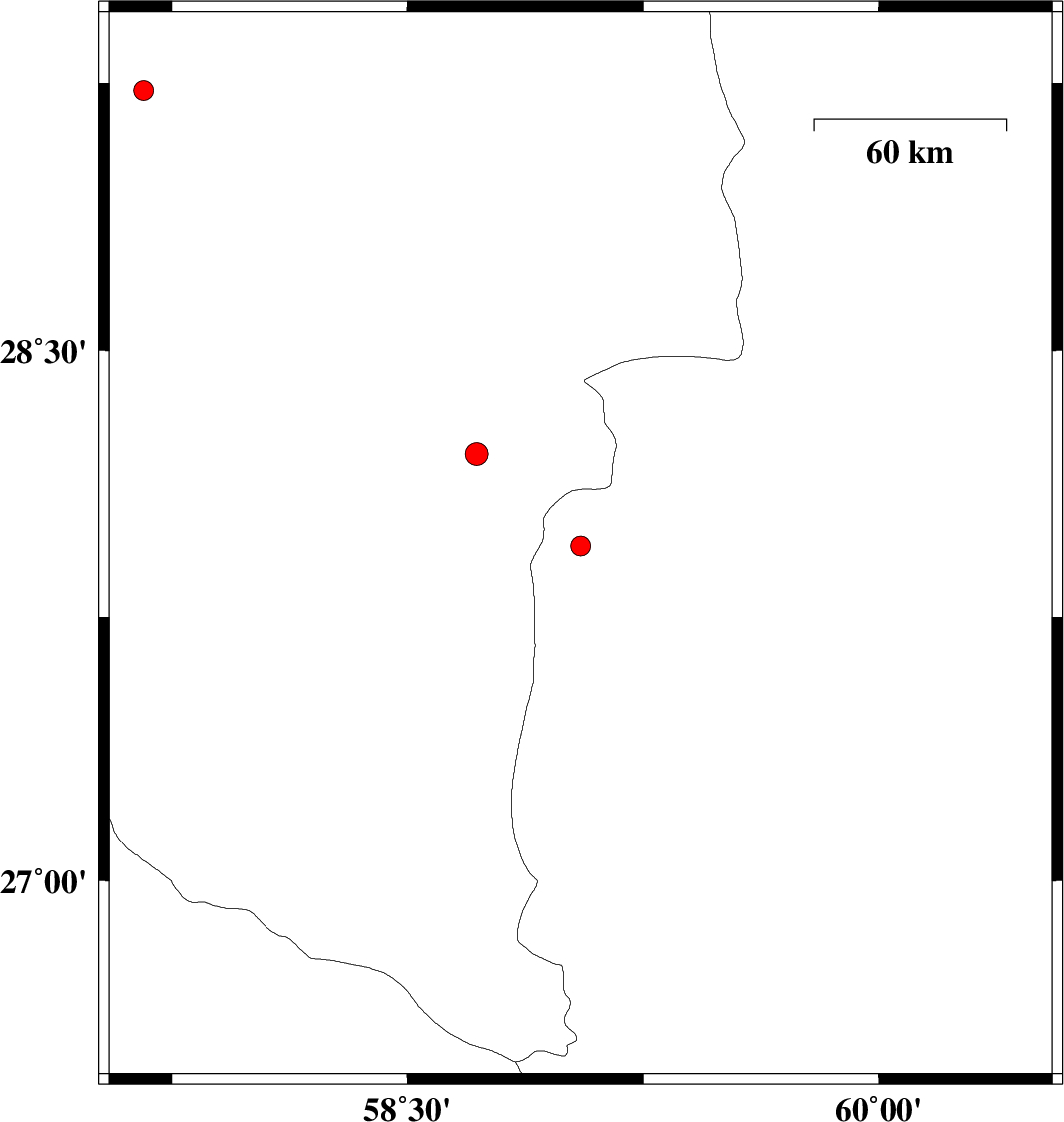 2012/09/19 | 22:09:12.6 | 02:39:12.6 | 28.21 | 58.72 | 18 | ML:3.2 | Kerman Province, 106 km South-East of Bam | ||