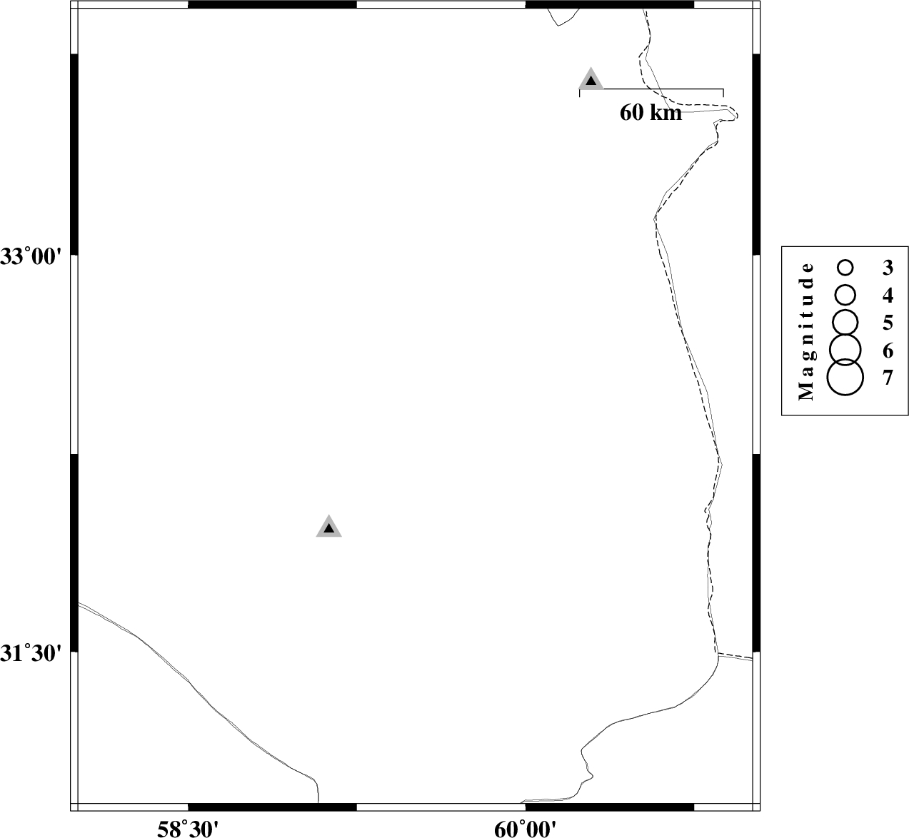 2012/09/17 | 11:05:03.2 | 15:35:03.2 | 32.02 | 58.38 | 14 | ML:2.9 | Khorasan(south) Province, 126 km South-West of Birjand |