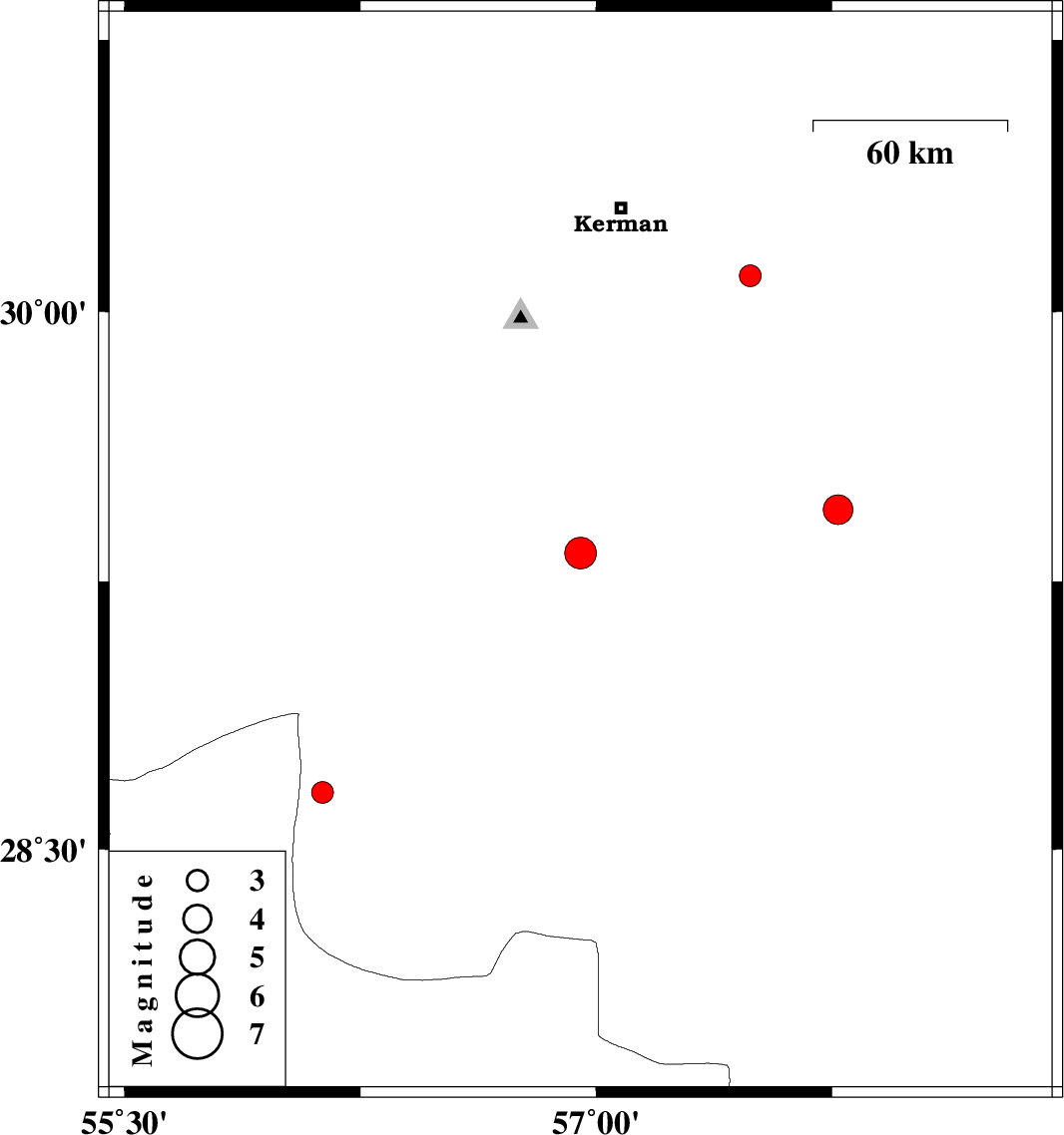 2012/10/06 | 00:16:14.9 | 03:46:14.9 | 30.1 | 57.49 | 15 | ML:3.1 | Kerman Province, 45 km South-East of Kerman |