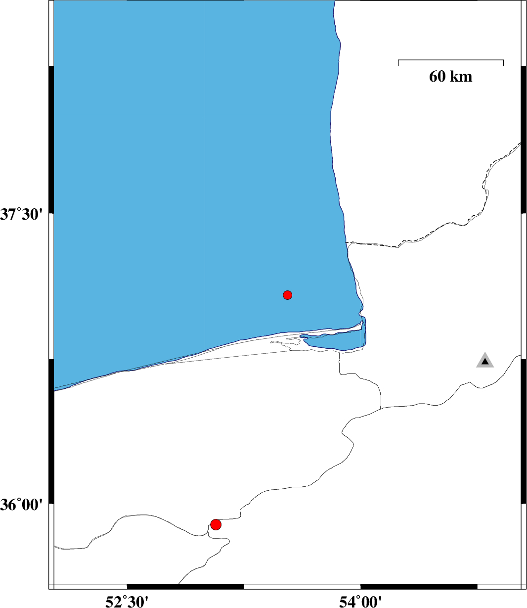 2012/11/05 | 01:12:50.2 | 04:42:50.2 | 37.08 | 53.53 | 14 | ML:2.5 | Caspian Sea, 43 km North of Behshahr | ||