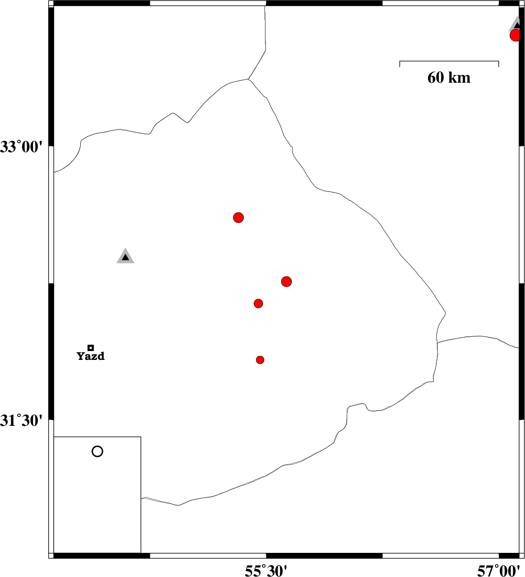2012/11/11 | 19:47:41.5 | 23:17:41.5 | 33.6 | 57.11 | 11 | ML:3.5 | Yazd Province, 17 km East of Tabas | ||