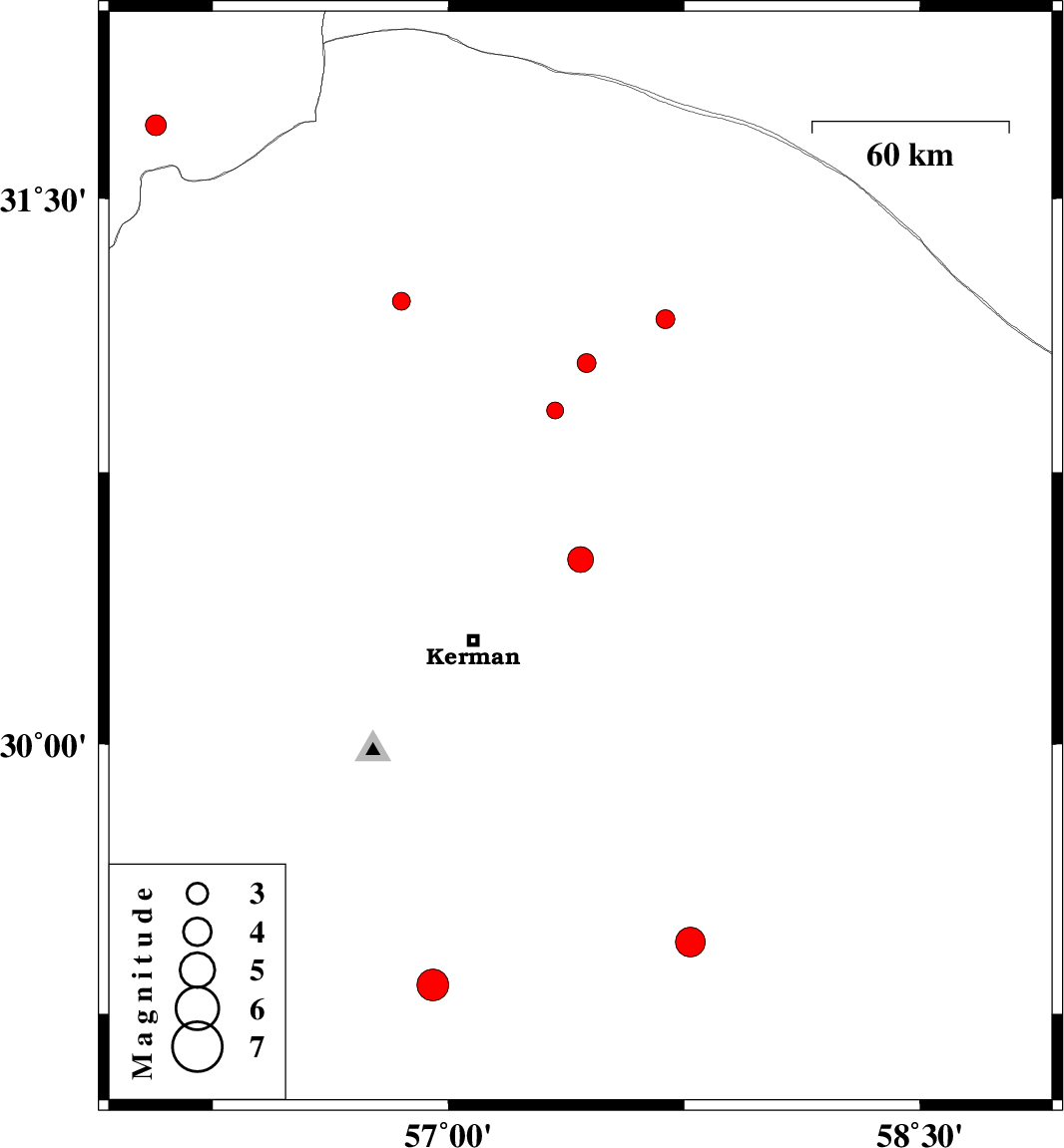 2012/11/14 | 00:46:13.4 | 04:16:13.4 | 30.51 | 57.42 | 16 | ML:3.6 | Kerman Province, 40 km North-East of Kerman | ||