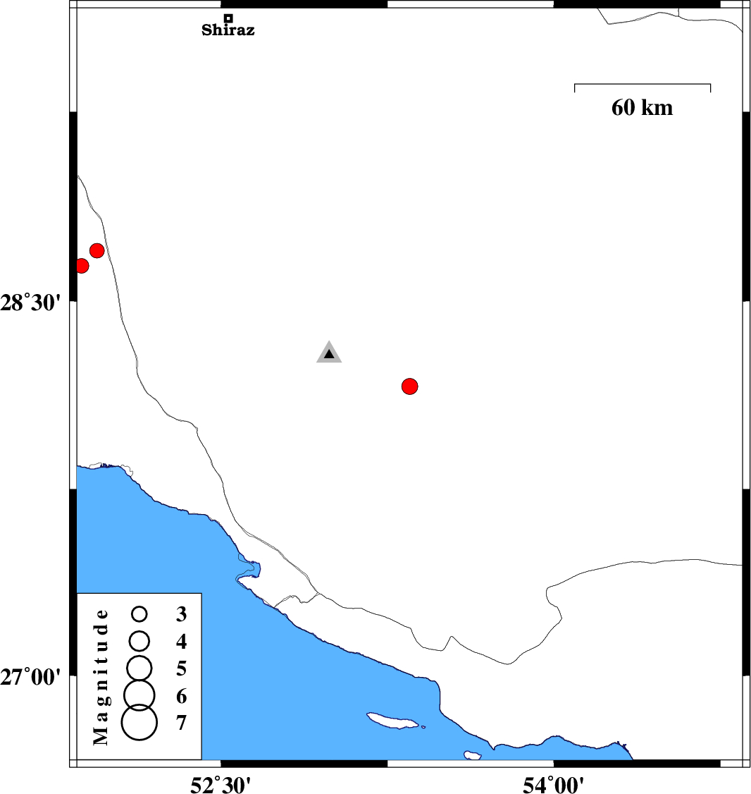 2012/11/10 | 01:46:16.0 | 05:16:16.0 | 28.64 | 51.87 | 28 | ML:3 | Bushehr Province, 33 km South-West of Farashband |