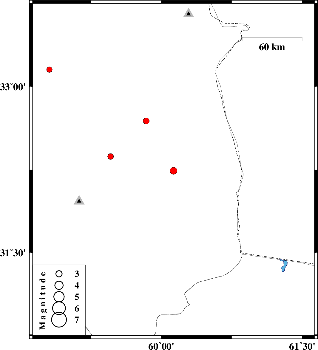 2012/11/16 | 21:34:54.3 | 01:04:54.3 | 33.15 | 58.81 | 33 | ML:2.7 | Khorasan(south) Province, 48 km North-West of Birjand | ||