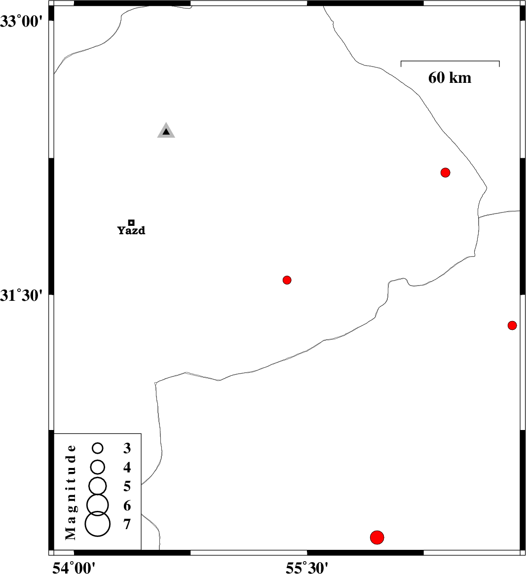 2012/12/13 | 13:59:12.9 | 17:29:12.9 | 32.17 | 56.39 | 14 | ML:2.7 | Yazd Province, 108 km North-West of Ravar |