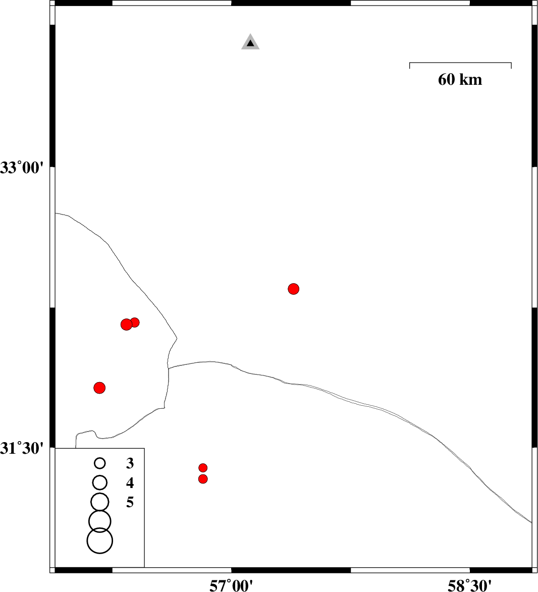 2012/12/05 | 07:43:12.9 | 11:13:12.9 | 31.39 | 56.82 | 14 | ML:2.4 | Kerman Province, 14 km North of Ravar |