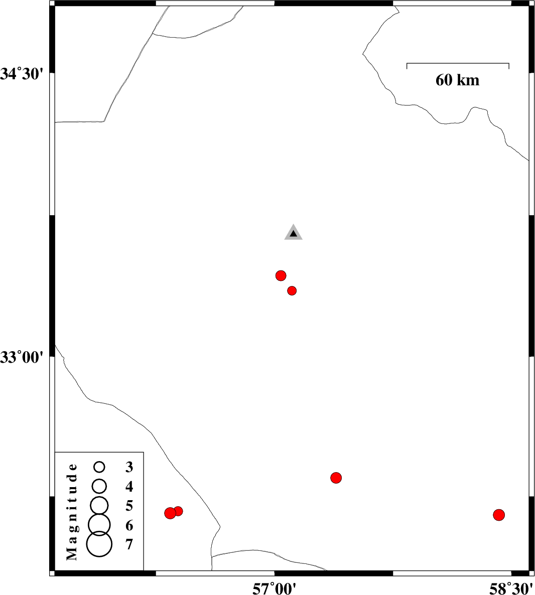 2013/01/07 | 12:42:56.1 | 16:12:56.1 | 33.43 | 57.04 | 14 | ML:2.9 | Yazd Province, 22 km South-East of Tabas | ||