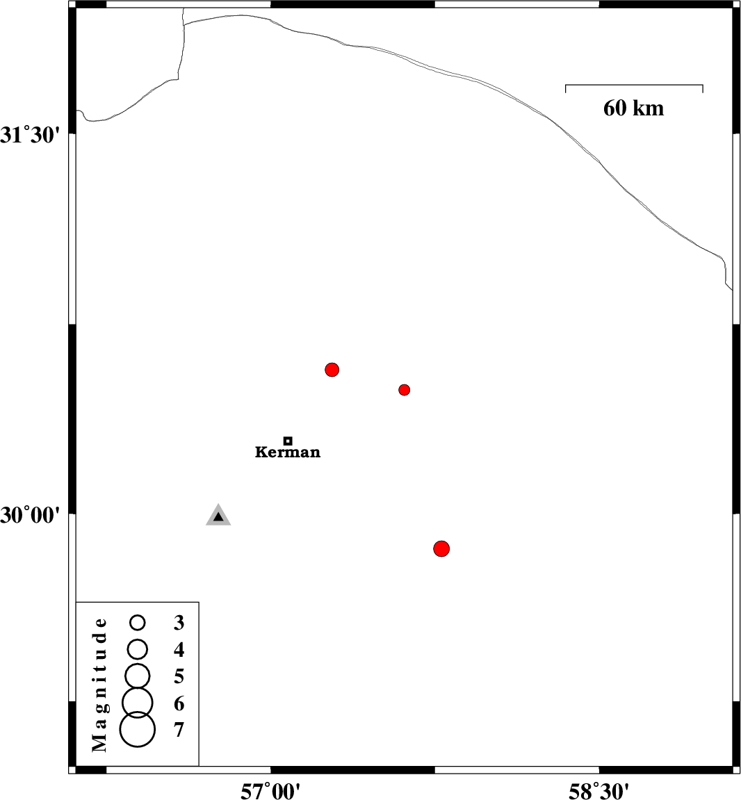 2013/03/23 | 14:09:40.5 | 18:39:40.5 | 30.57 | 57.28 | 16 | ML:2.8 | Kerman Province, 37 km North-East of Kerman |