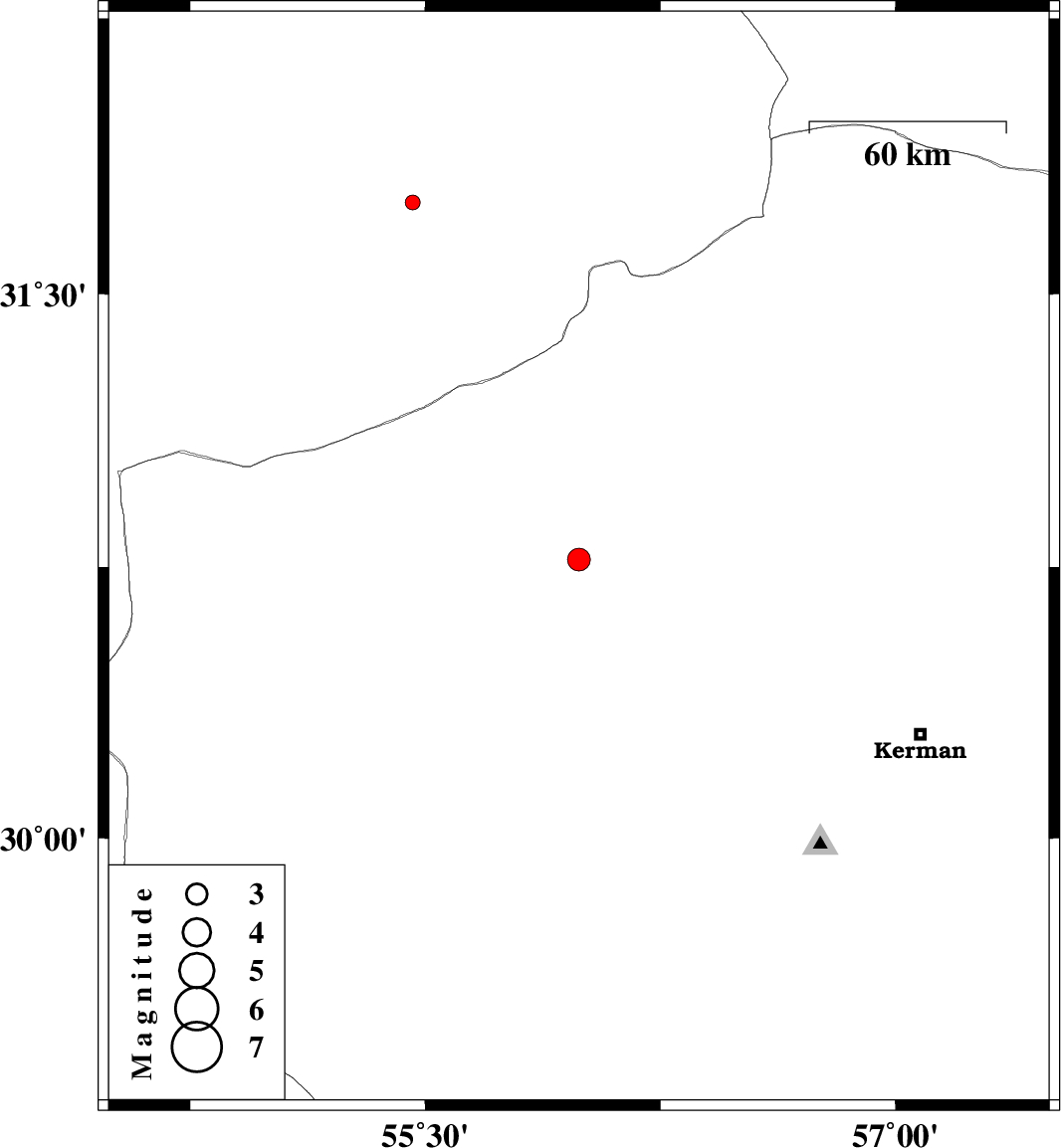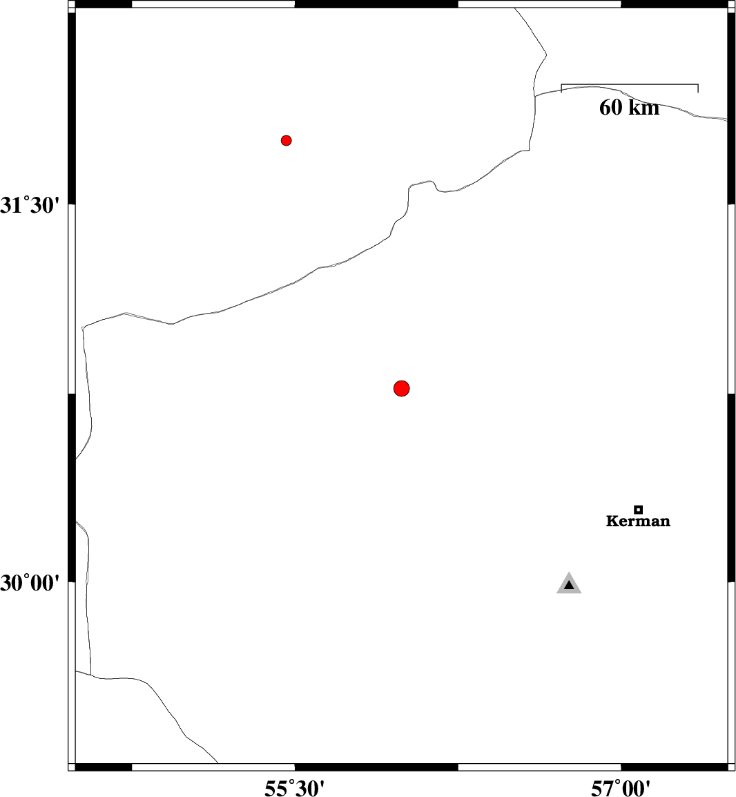 2013/04/17 | 18:36:20.3 | 23:06:20.3 | 30.77 | 55.99 | 18 | ML:3.3 | Kerman Province, 41 km North of Rafsanjan | ||