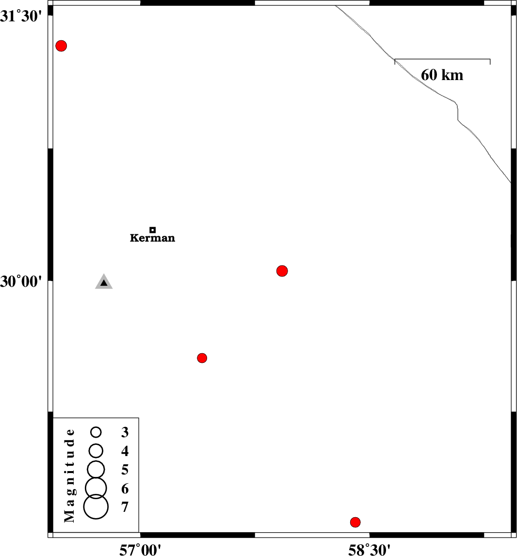| 2015/07/17 | 19:55:01.3 | 00:25:01.3 | 29.558 | 57.404 | 18 | ML2.8 | Kerman Province, 87 km South-East of Kerman |
