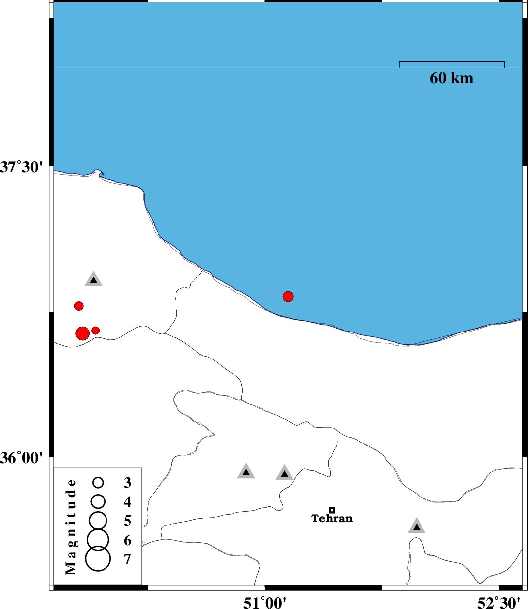 | 2015/06/30 | 07:55:30.6 | 12:25:30.6 | 36.64 | 49.83 | 15 | ML3.9 | Gilan Province, 44 km North-West of Qazvin | ||