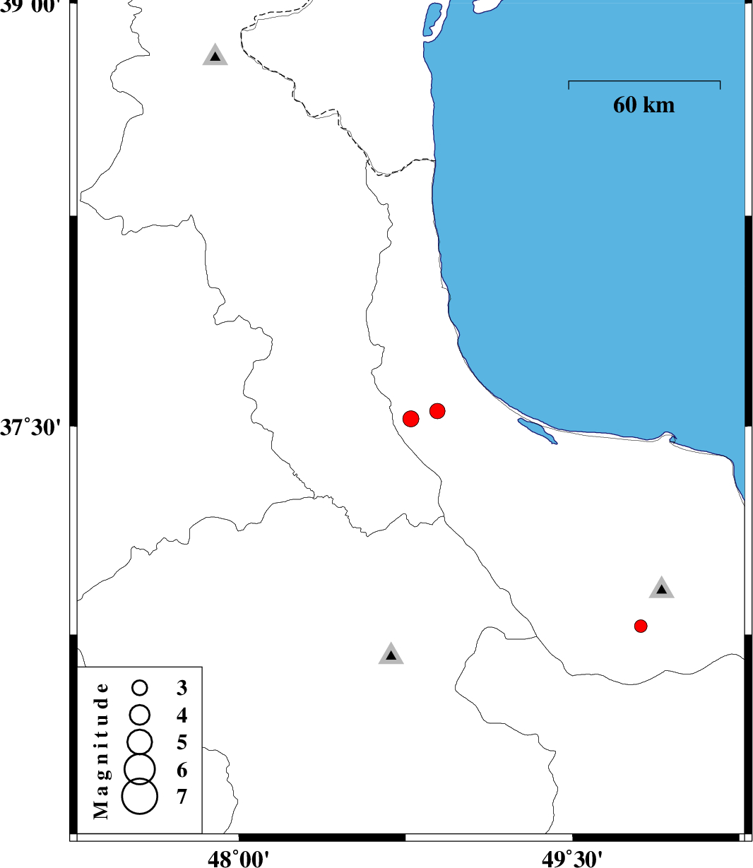 | 2015/07/23 | 06:08:03.1 | 10:38:03.1 | 36.781 | 49.807 | 14 | ML2.6 | Gilan Province, 34 km -East of Rudbar |