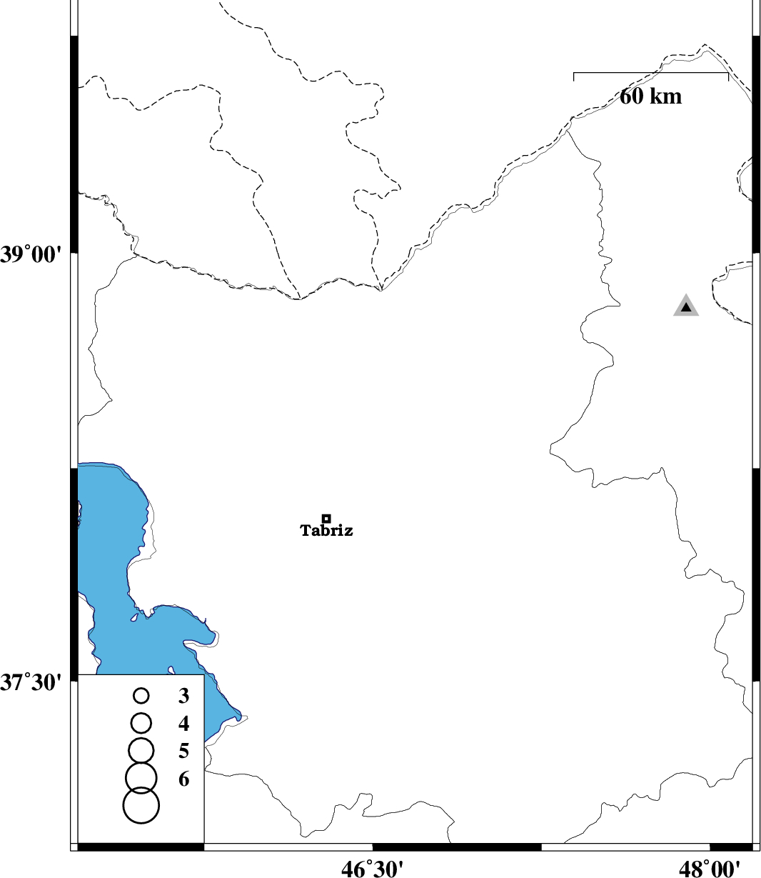 | 2015/08/06 | 20:30:07.9 | 01:00:07.9 | 38.423 | 46.688 | 14 | ML3.7 | Azarbaijan Sharghi Province, 35 km -West of Ahar |