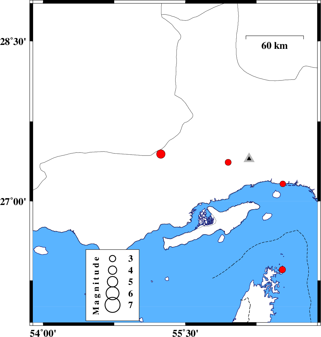 | 2015/08/08 | 22:12:12.5 | 02:42:12.5 | 26.338 | 55.964 | 15 | ML3.1 | Persian Gulf, 75 km South-West of Qeshm | ||