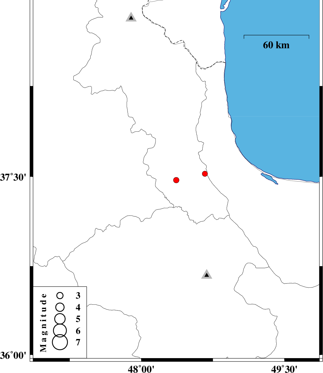 | 2015/08/15 | 23:09:34.6 | 03:39:34.6 | 37.523 | 48.667 | 27 | ML2.5 | Ardebil Province, 17 km South-East of Khalkhal |